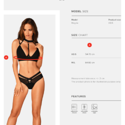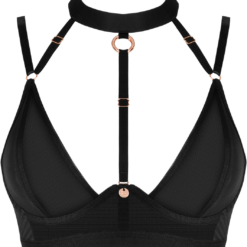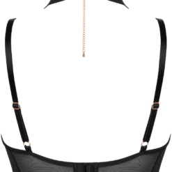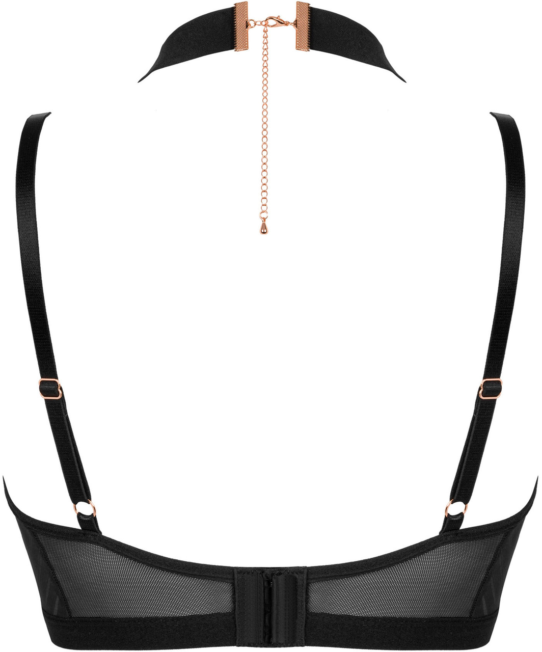 Black bra with supportive underwire. There’s a decorative elastic choker which is connected to the bra with 3 elastic straps and fastens in the back with a decorative gold-coloured chain. The middle strap with a gold ring is easily removable. The bra has a three-row hook closure on the back, the length of the straps can be easily adjusted; the front of the bra is decorated with a gold-coloured pendant.