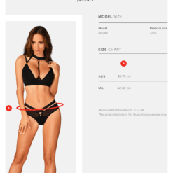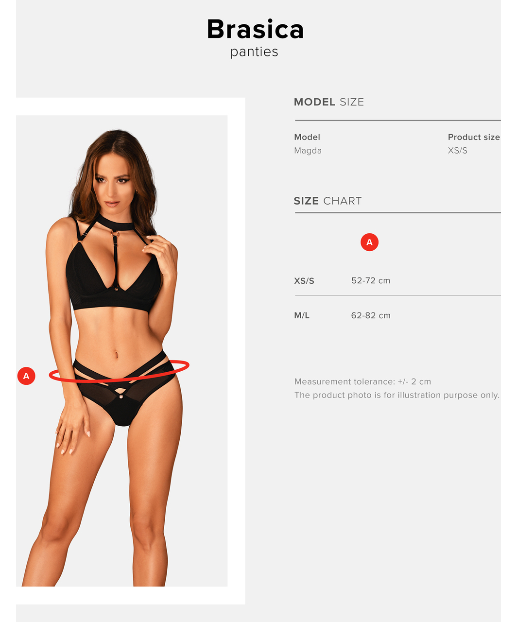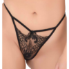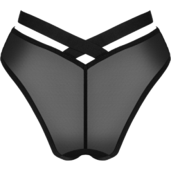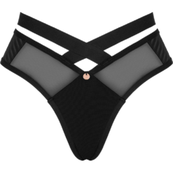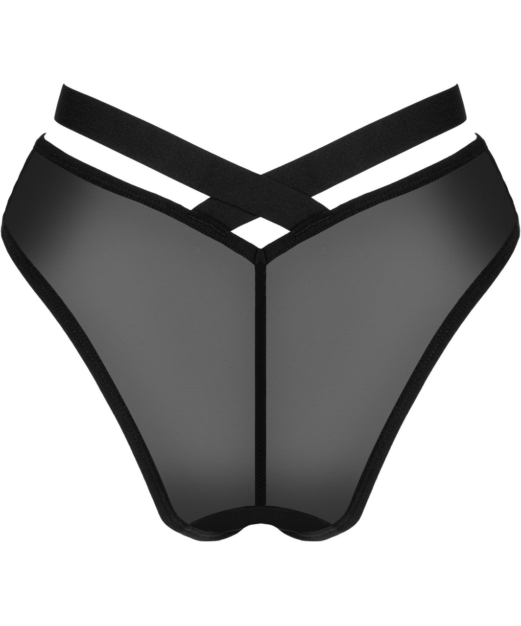 Black panties with translucent mesh details and a V-shaped cut with decorative straps. The front is decorated with a rose gold coloured pendant.
