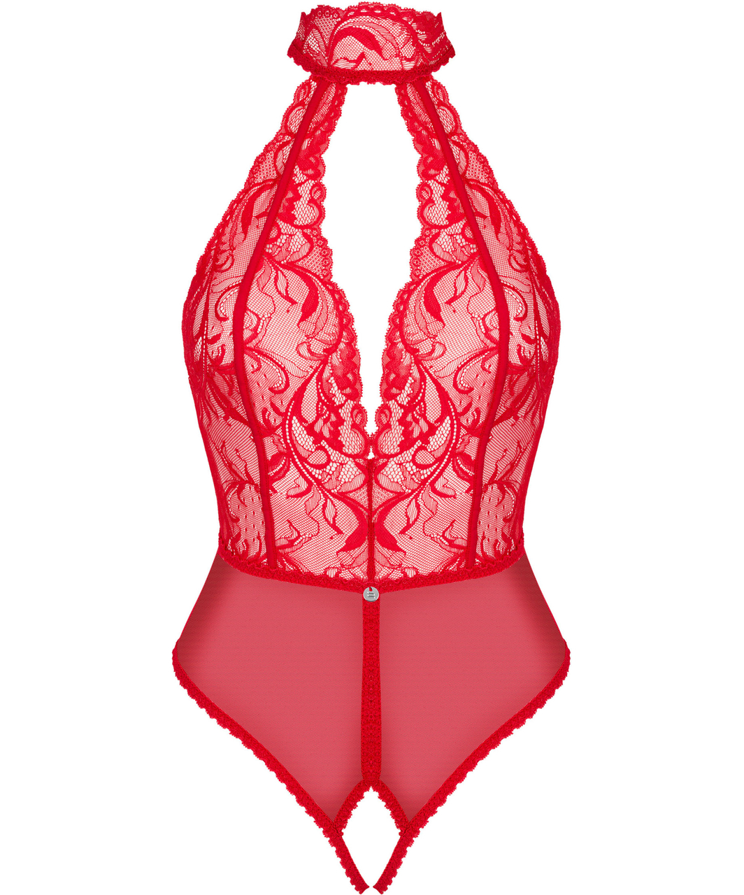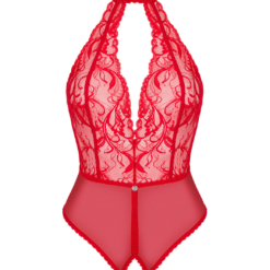 Red lace and mesh bodysuit with a plunging neckline and a seductive slit at the bottom. The body is tied around the neck with an atlas ribbon. The front side is decorated with a silver colored pendant.