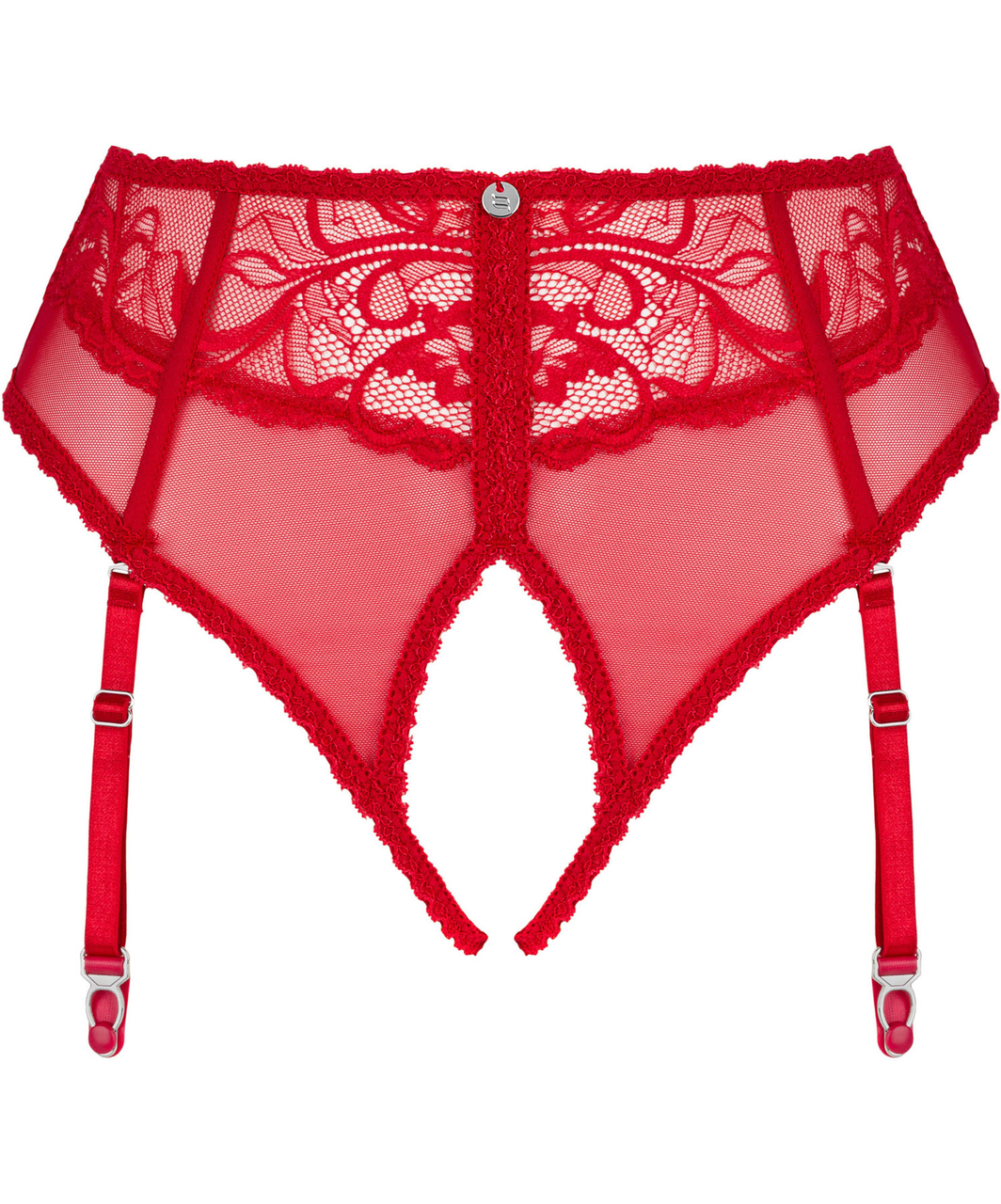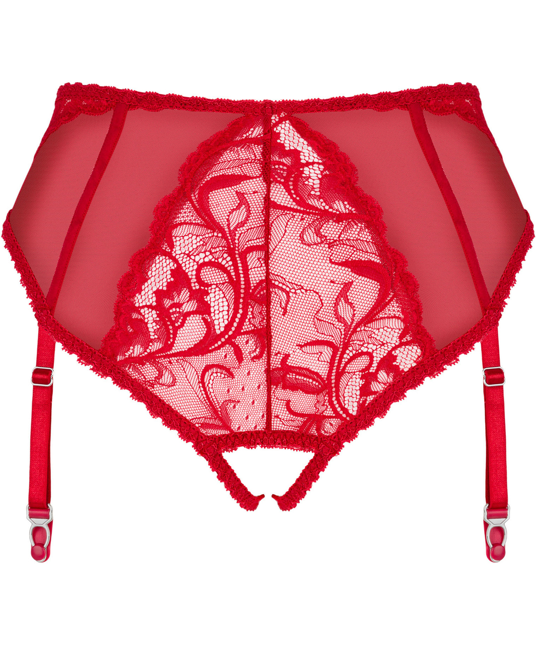 Red crotchless lace and mesh panties with four suspenders. Suspenders are detachable; their length can be easily adjusted.