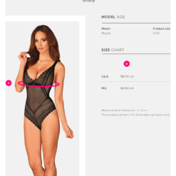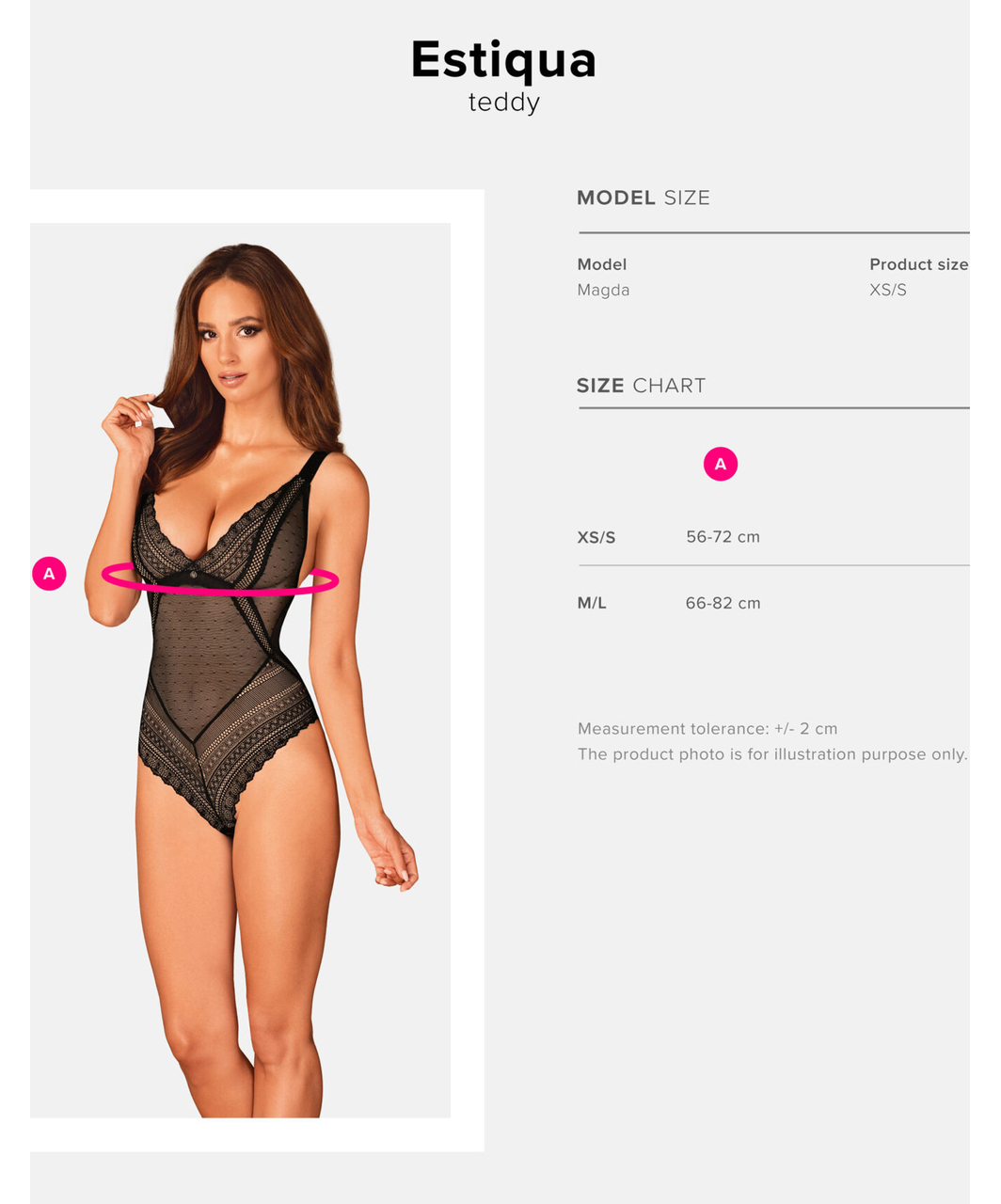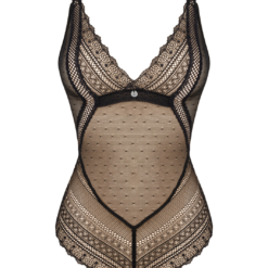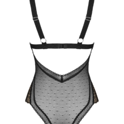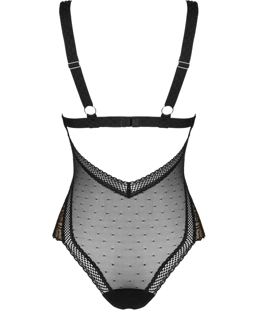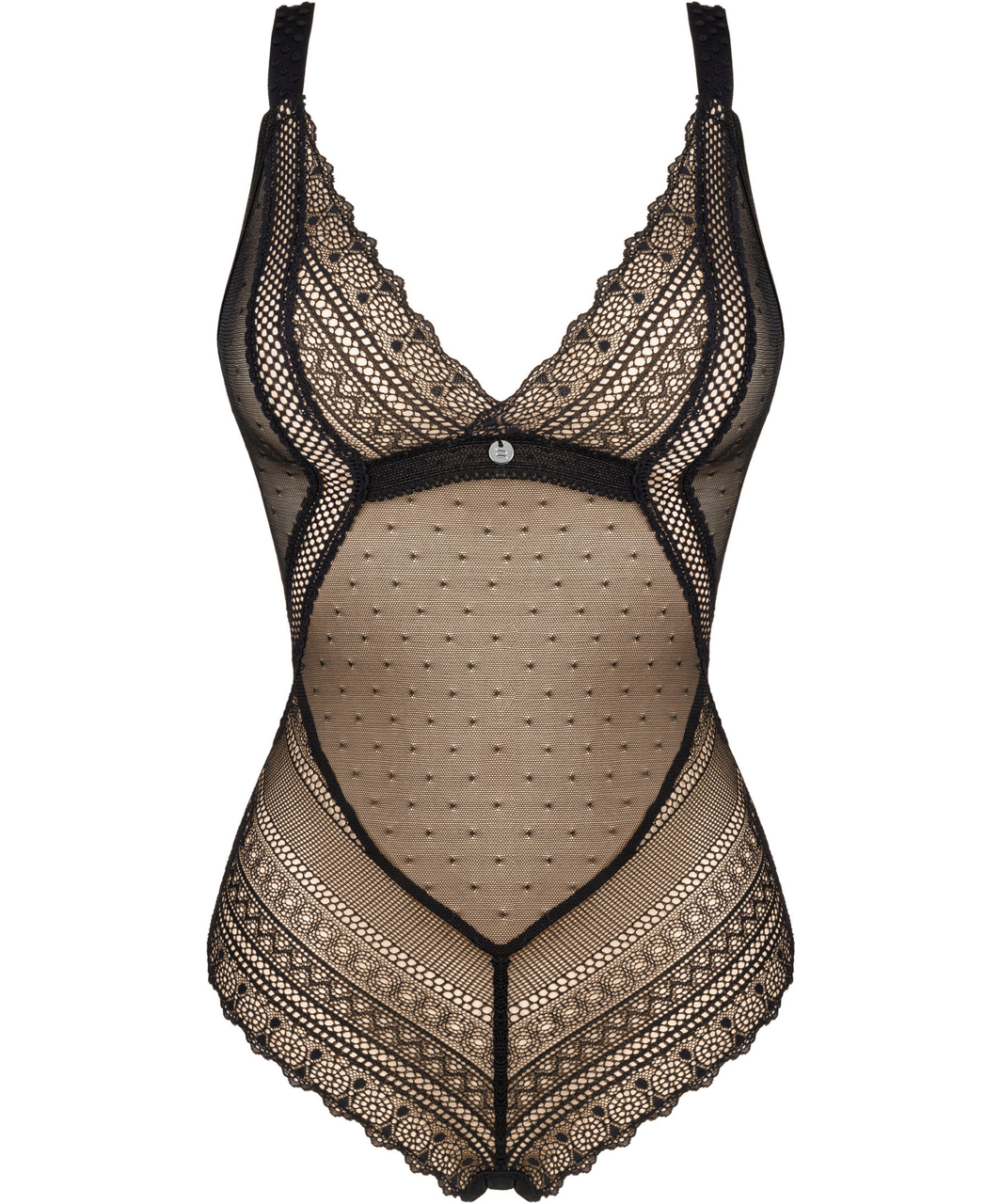 Black transparent and patterned lace bodysuit with an open back and beige lining on the front. The length of the straps is easily adjustable, the back has a single-row hook closure.