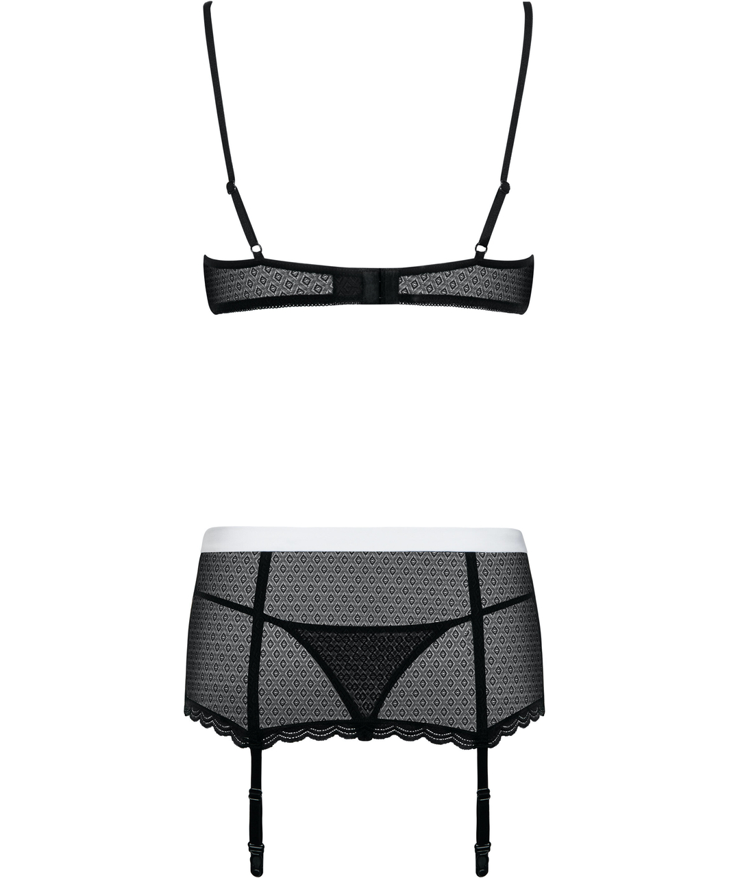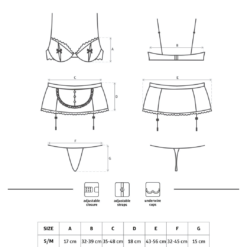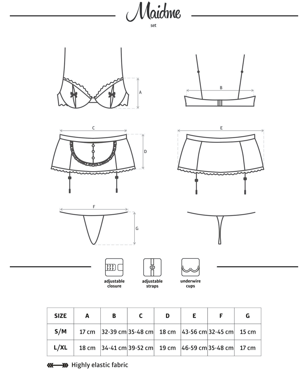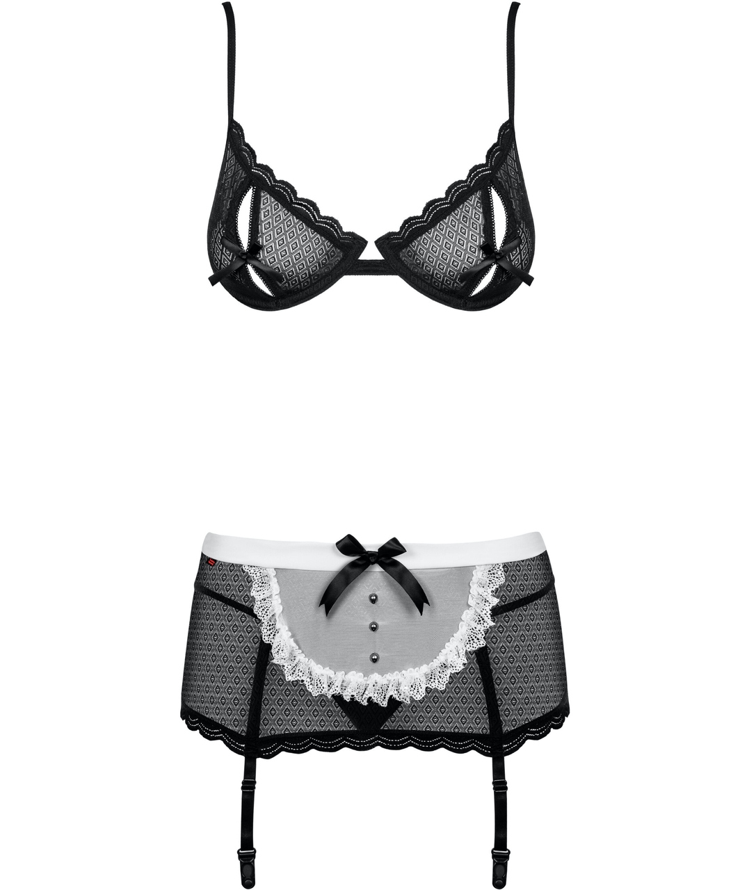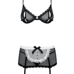 Voulez-Vous, Monsieur… This seductive French maid will charge the room with electricity enough to power the Eiffel Tower at night. The set includes: black sheer mesh garter belt with white apron, matching underwire bra with peek-a-boo cups, black G-string, white net stockings and headband. The garters and straps as well as hook closure of the bra are adjustable.