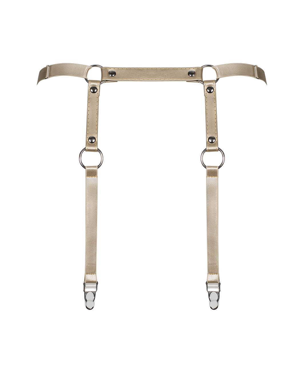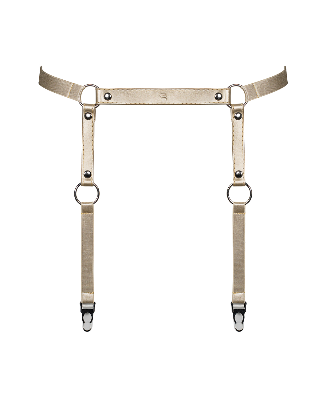 Gold-coloured leatherette garter belt with metal rings and studs. Garters are adjustable.