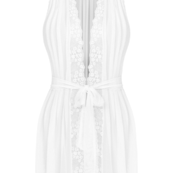 White sheer mesh sleeveless dressing gown with a sash. Soft and airy, lightweight fabric with delicate lace trimming.