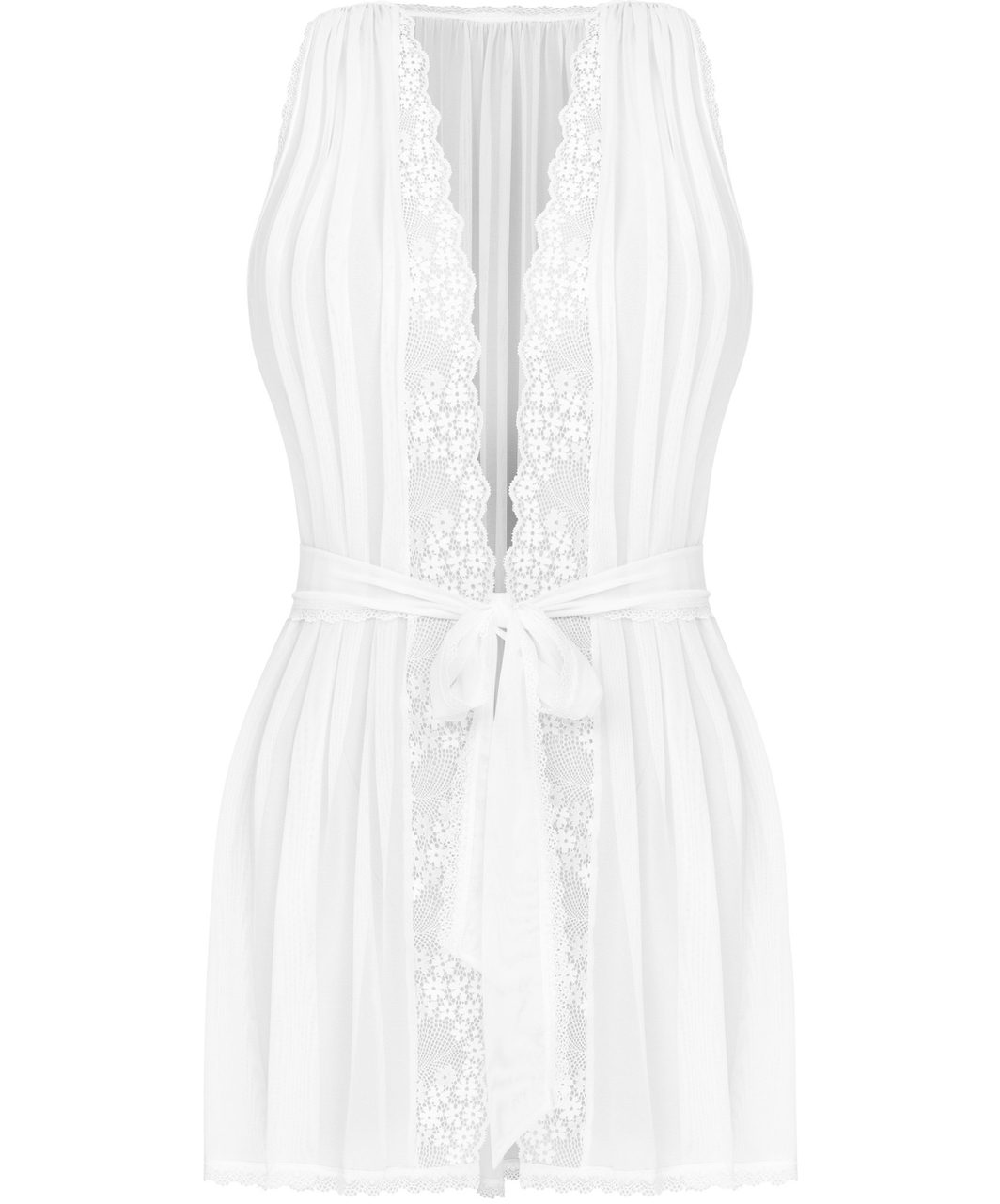White sheer mesh sleeveless dressing gown with a sash. Soft and airy, lightweight fabric with delicate lace trimming.