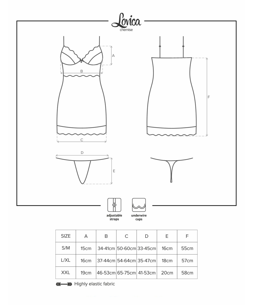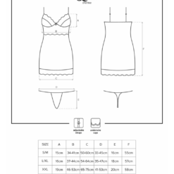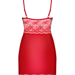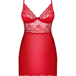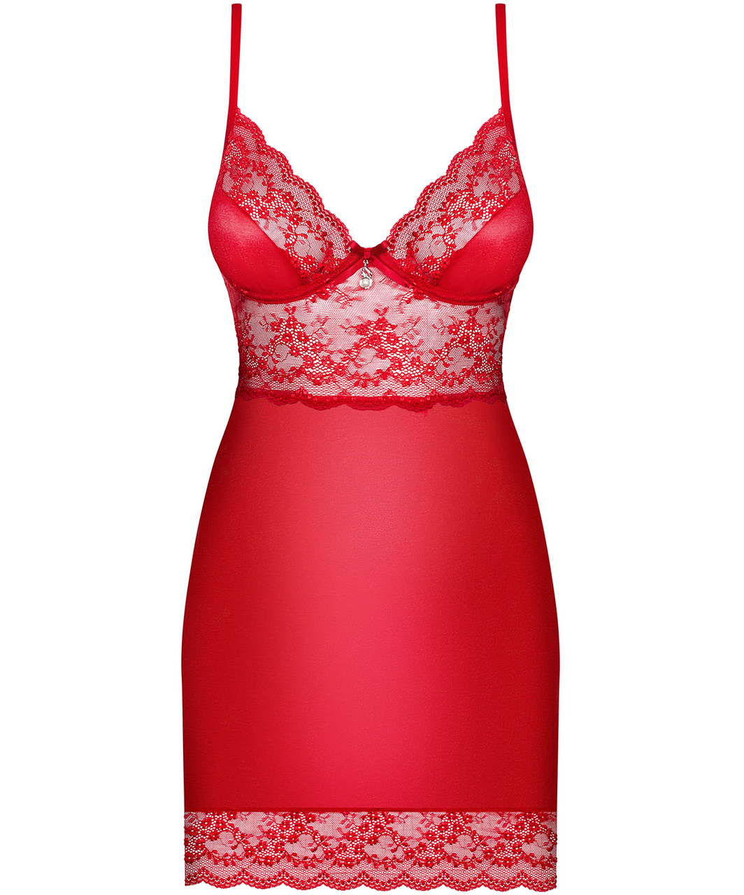 Splendid red chemise made of glossy satin with delicate flower pattern lace. Adorned with coquettish bow and beautiful silver-colored pendant with a pearl. Hemline made of soft lace. Underwire see-through cups for hot erotic moments. Straps are adjustable. Matching G-string included.