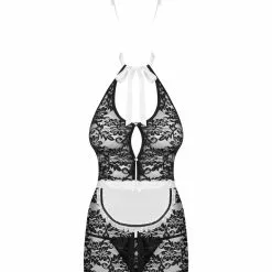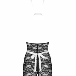 Maid’s erotic dress: a seductive black lace mini dress with an open back, a white apron and a headband. Dress ties around the neck with a white satin ribbon. Complete with matching thong.