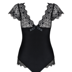 Black bodysuit with butterfly sleeves made of lace, underwire cups and lace trimming, with a hook-fastener at the crotch.