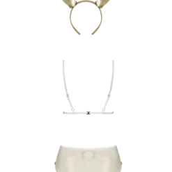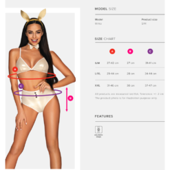 Erotic set made of pearlescent fabric with golden shimmer – soft bra with triangular cups, high waist panties with white fluffy tail, bow tie and gold-coloured headband with bunny ears. The bra has a hook fastener on the back. Straps are adjustable.