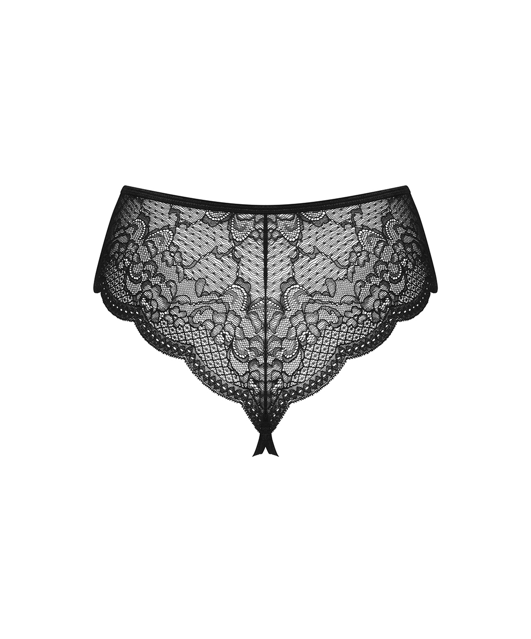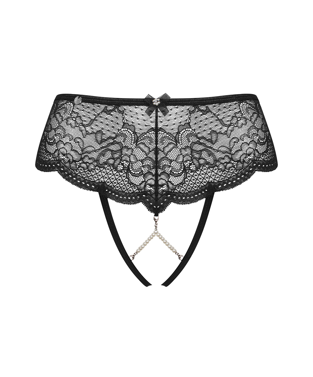 Black cheeky thong made of fine floral lace. Crotchless, adorned with detachable delicate pearls at the front.