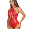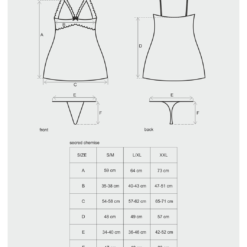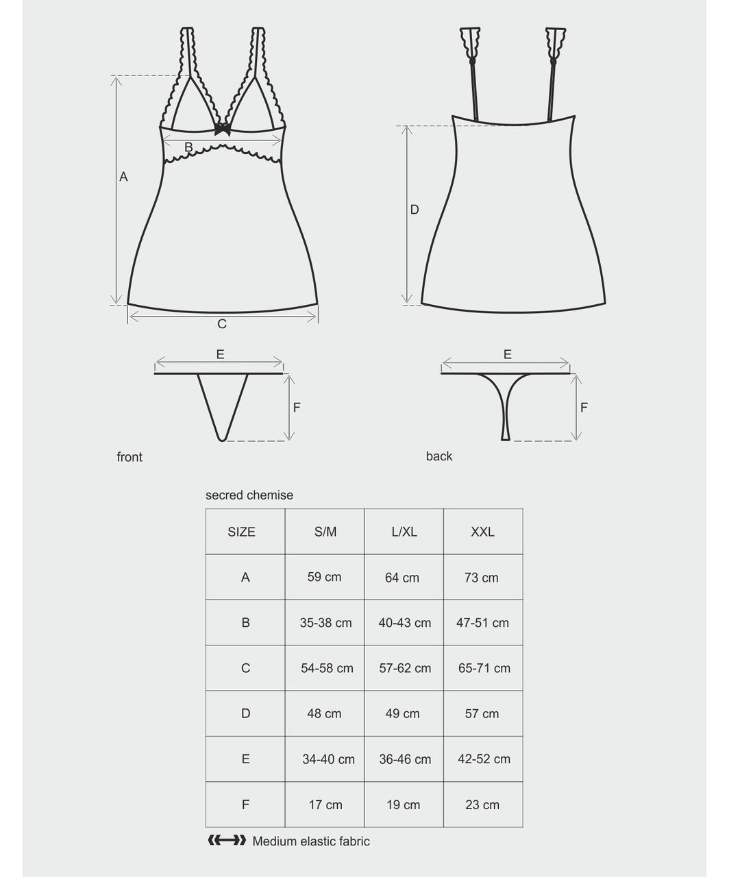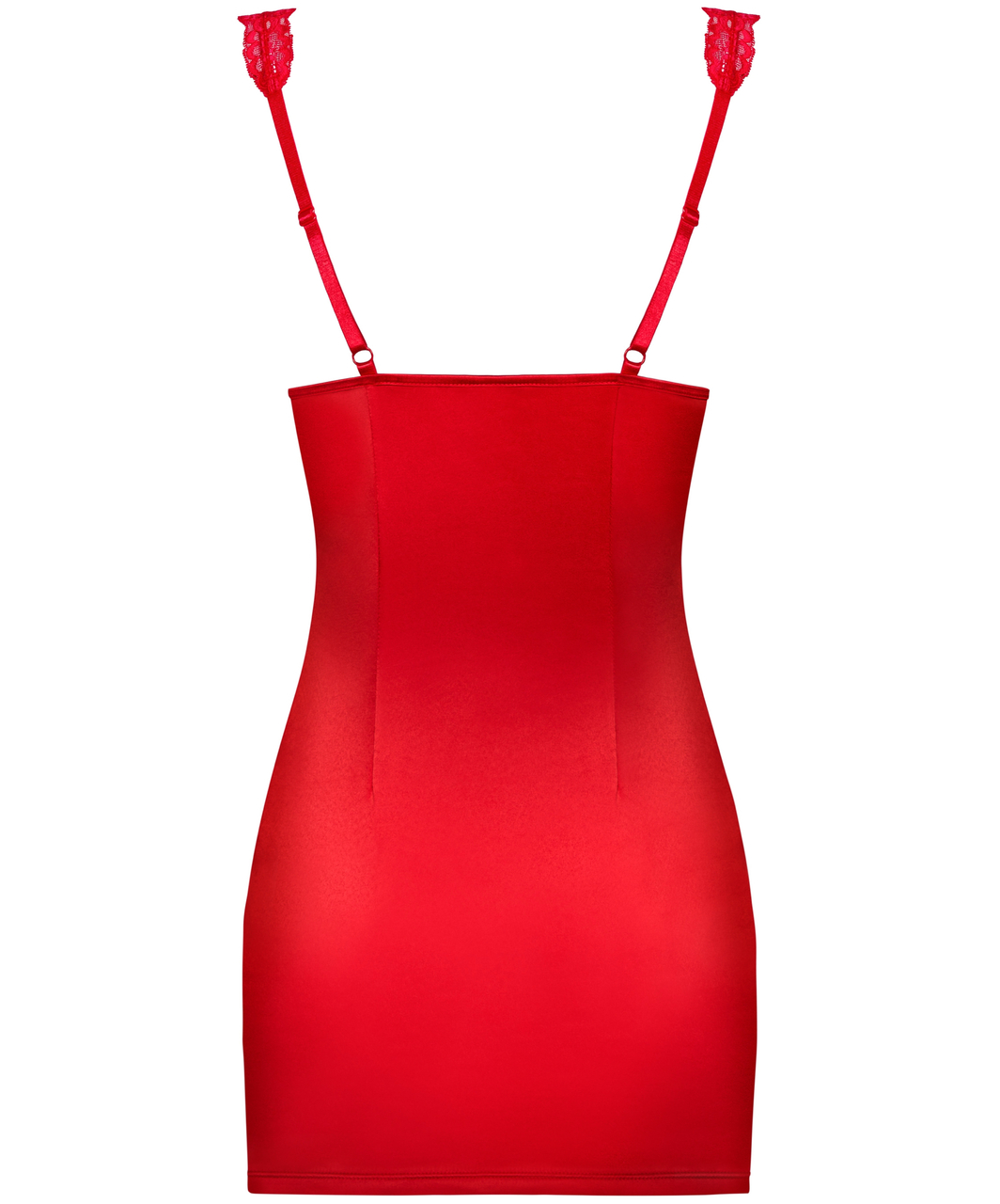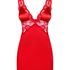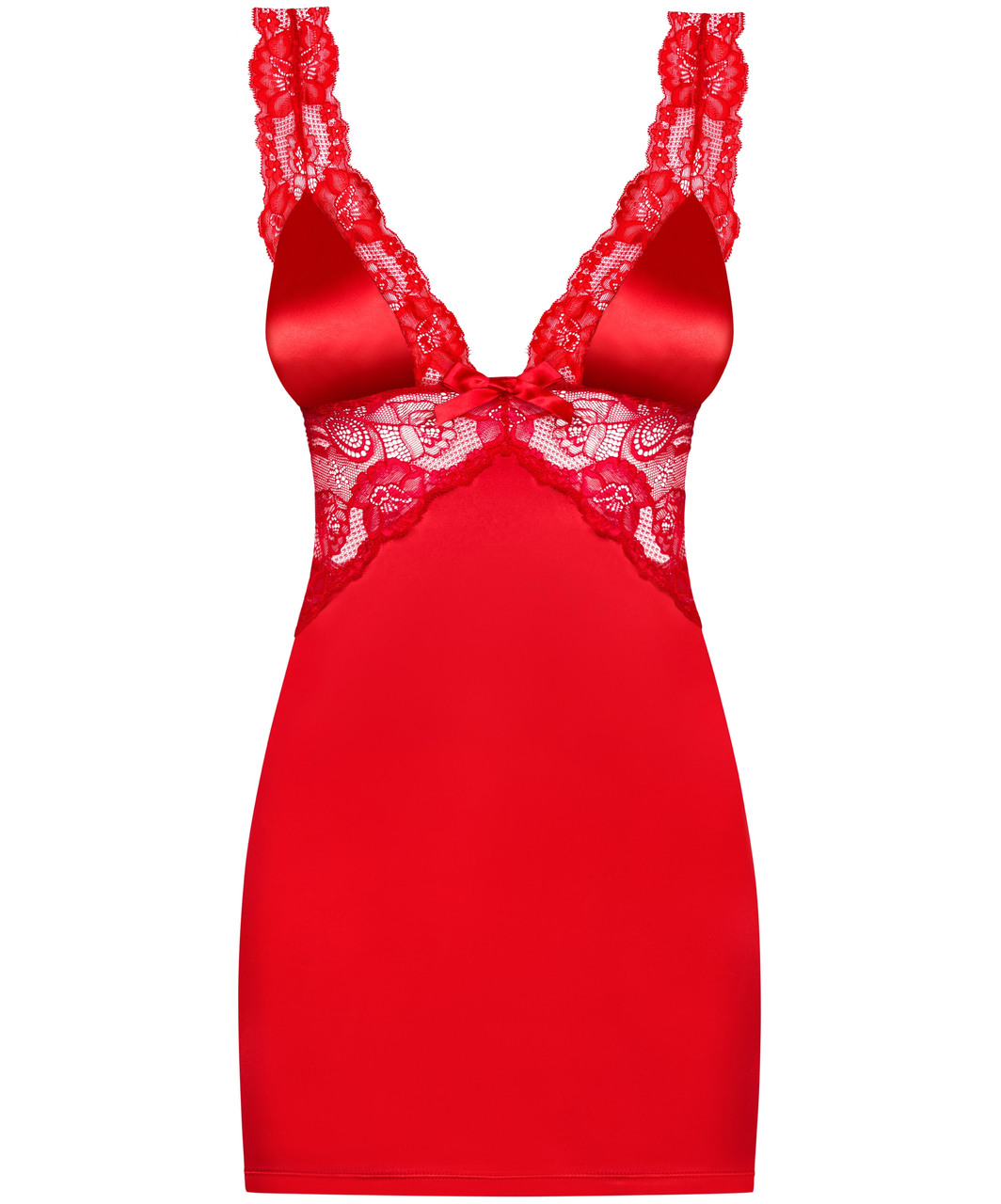 Red satin chemise with side inserts made of lace adorned with a bow. Straps are adjustable. Matching G-string included.