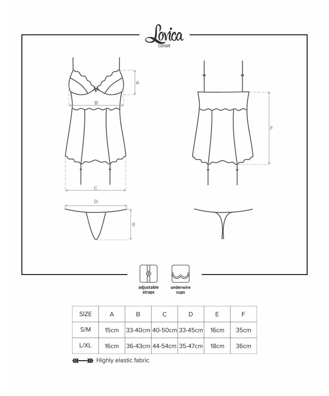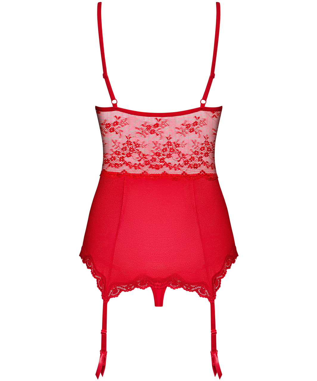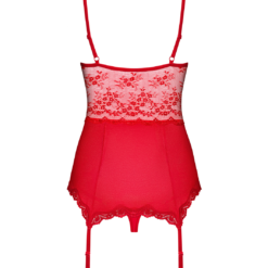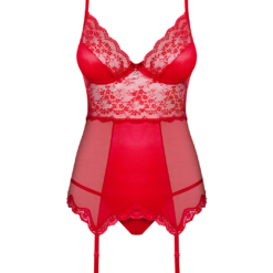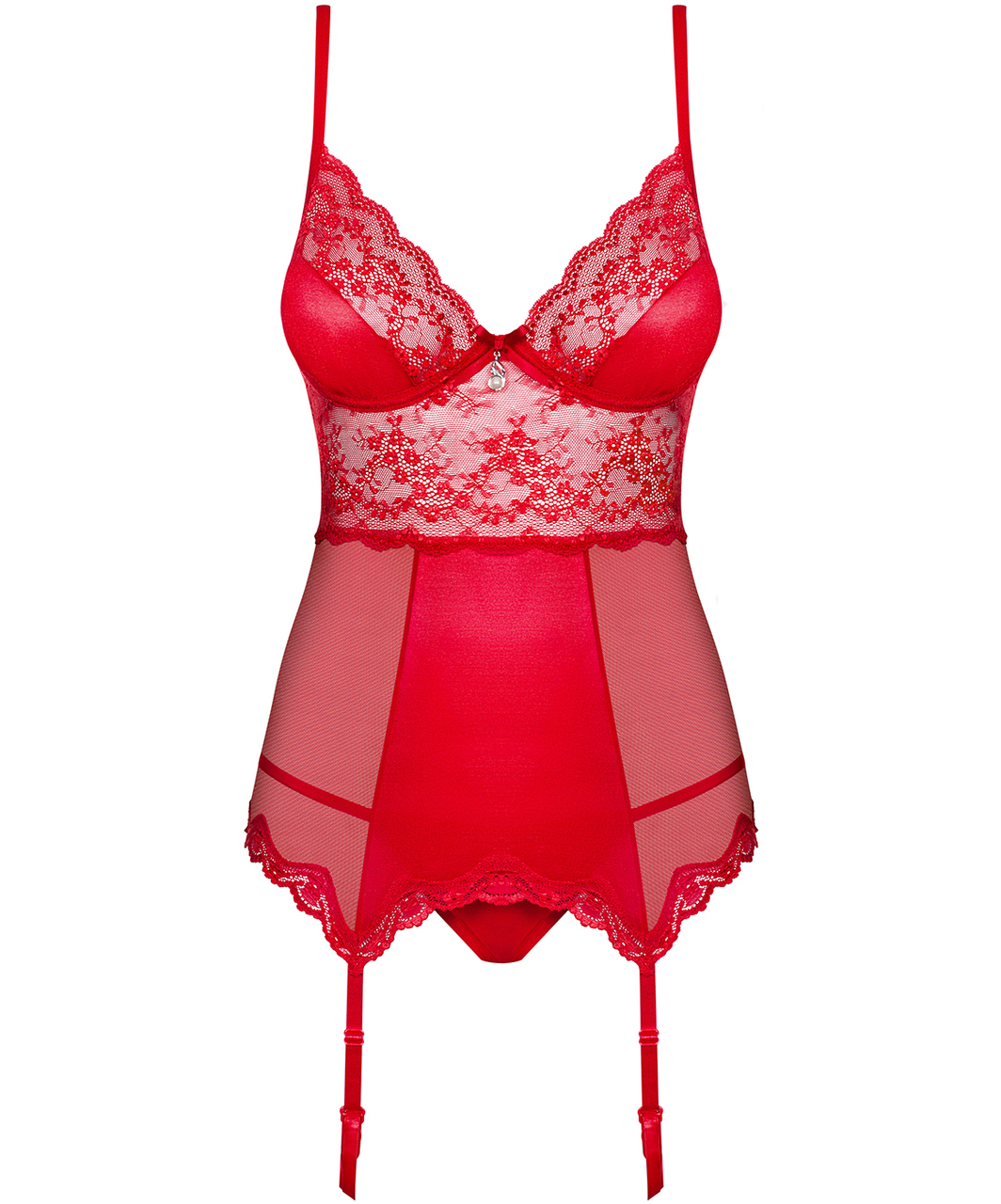 Exquisite red elastic basque made of sheer mesh, delicate lace and contrasting glossy satin, adorned with a coquettish bow and beautiful silver-colored pendant with a pearl. Underwire see-through cups for hot erotic moments. Adjustable straps and garters. Matching G-string included. Without stockings.