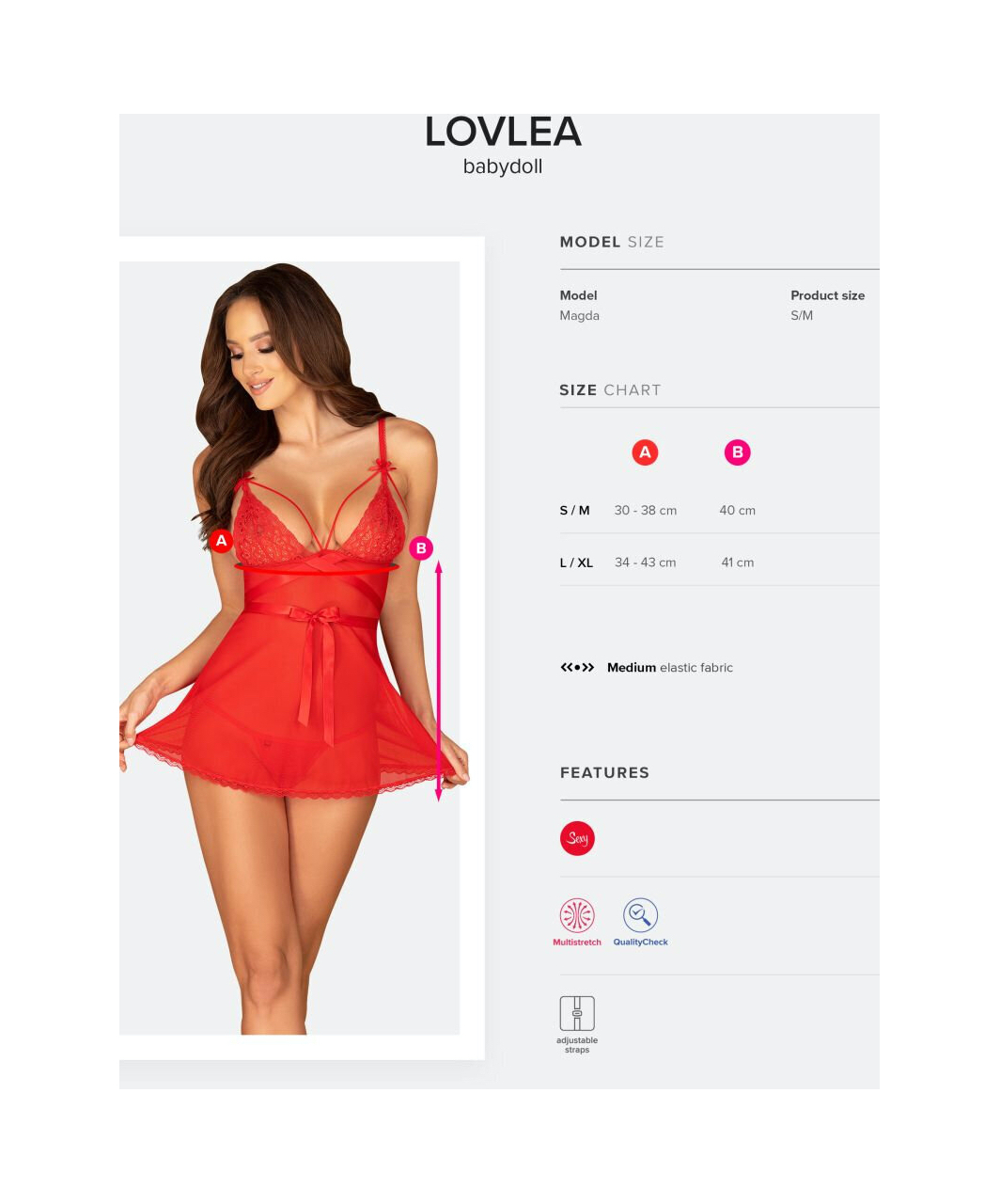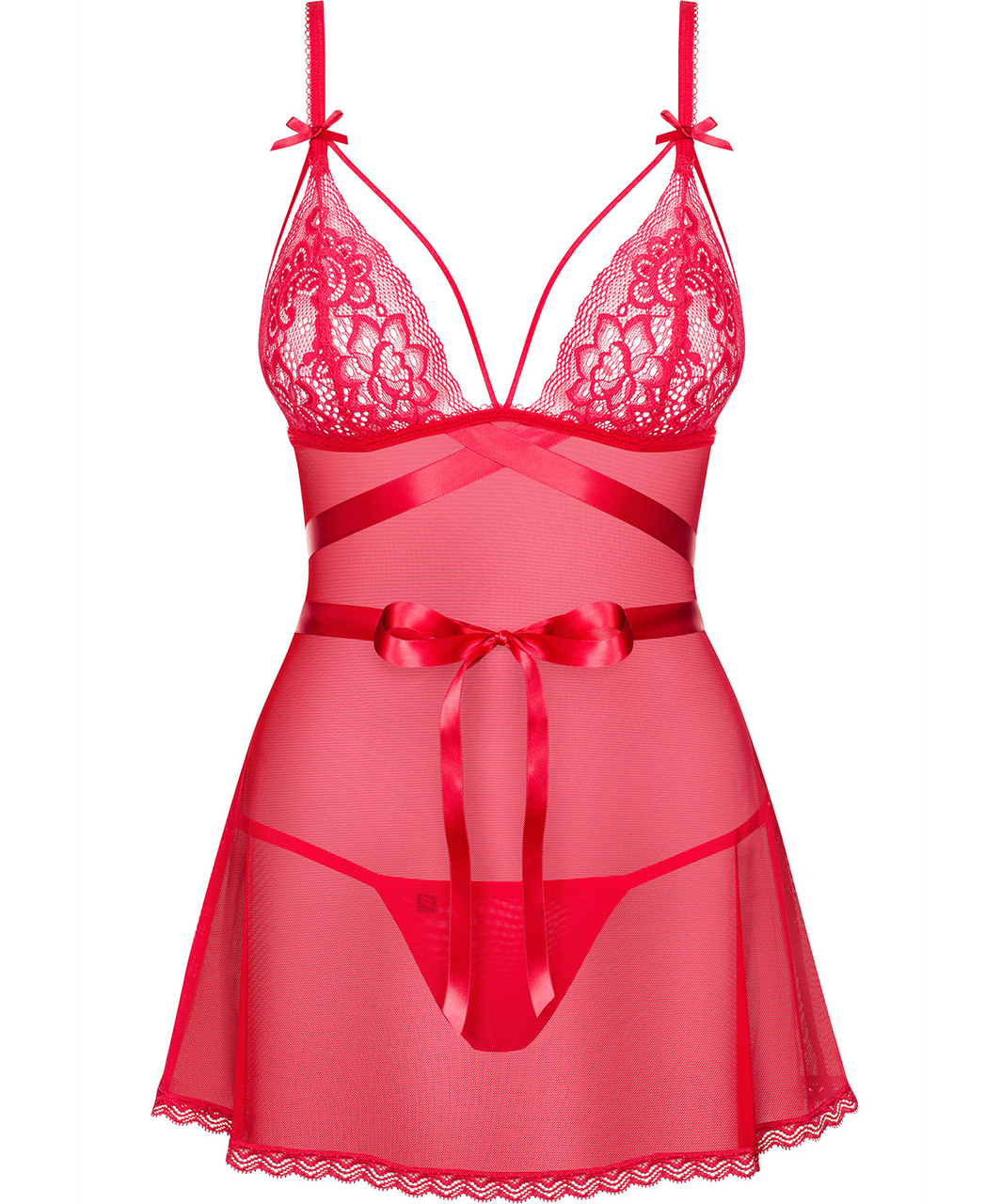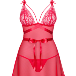 Cheeky red sheer mesh babydoll with lacy top and satin ribbon for a playful look. Straps are adjustable. Matching G-string included.
