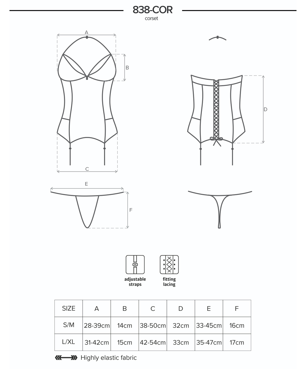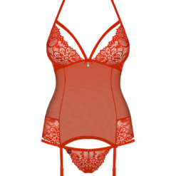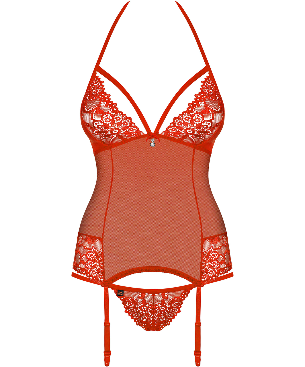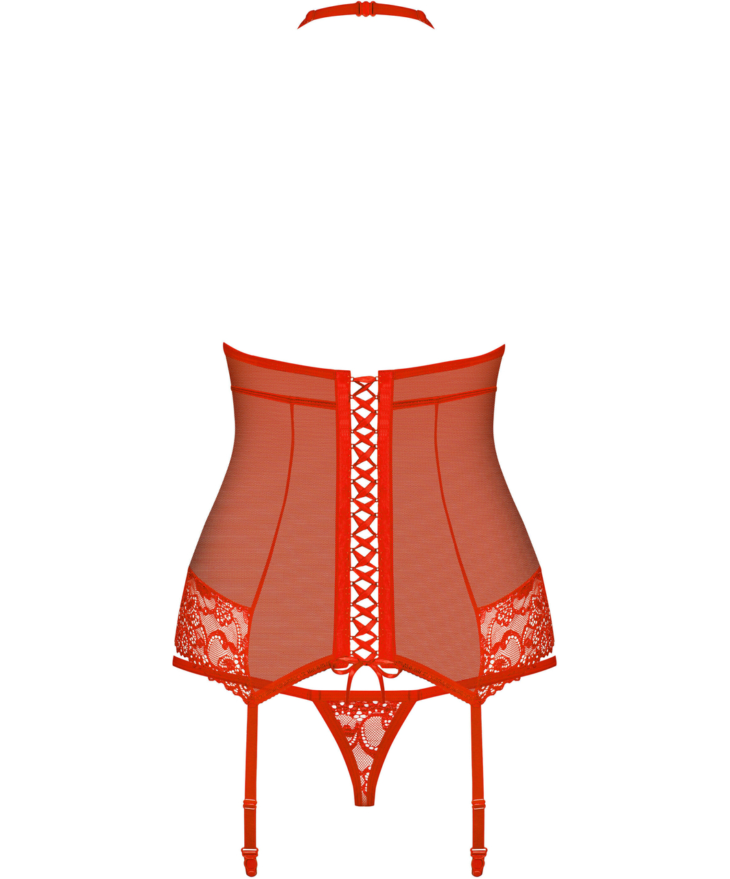 Red sheer mesh basque with lace inserts and lacing on the back. Adjustable straps and garters. Matching G-string included. Without stockings.