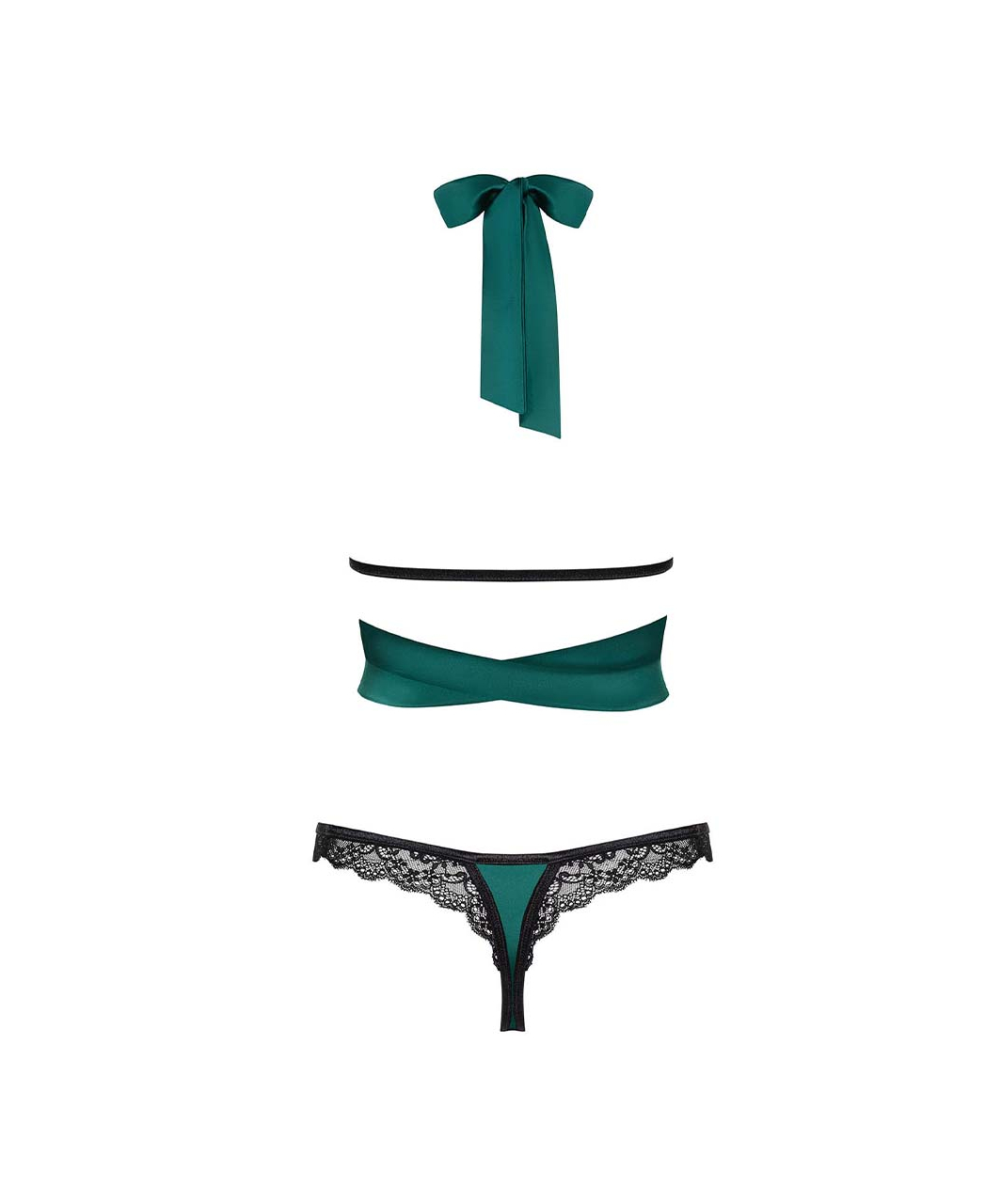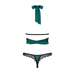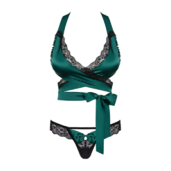 Tempting lingerie set in emerald green colour. SilkyTouch material and lace trimming. Lacing around the waist and on the neck and elastic strap on the back. Thong with bow and lace edge trim.