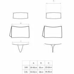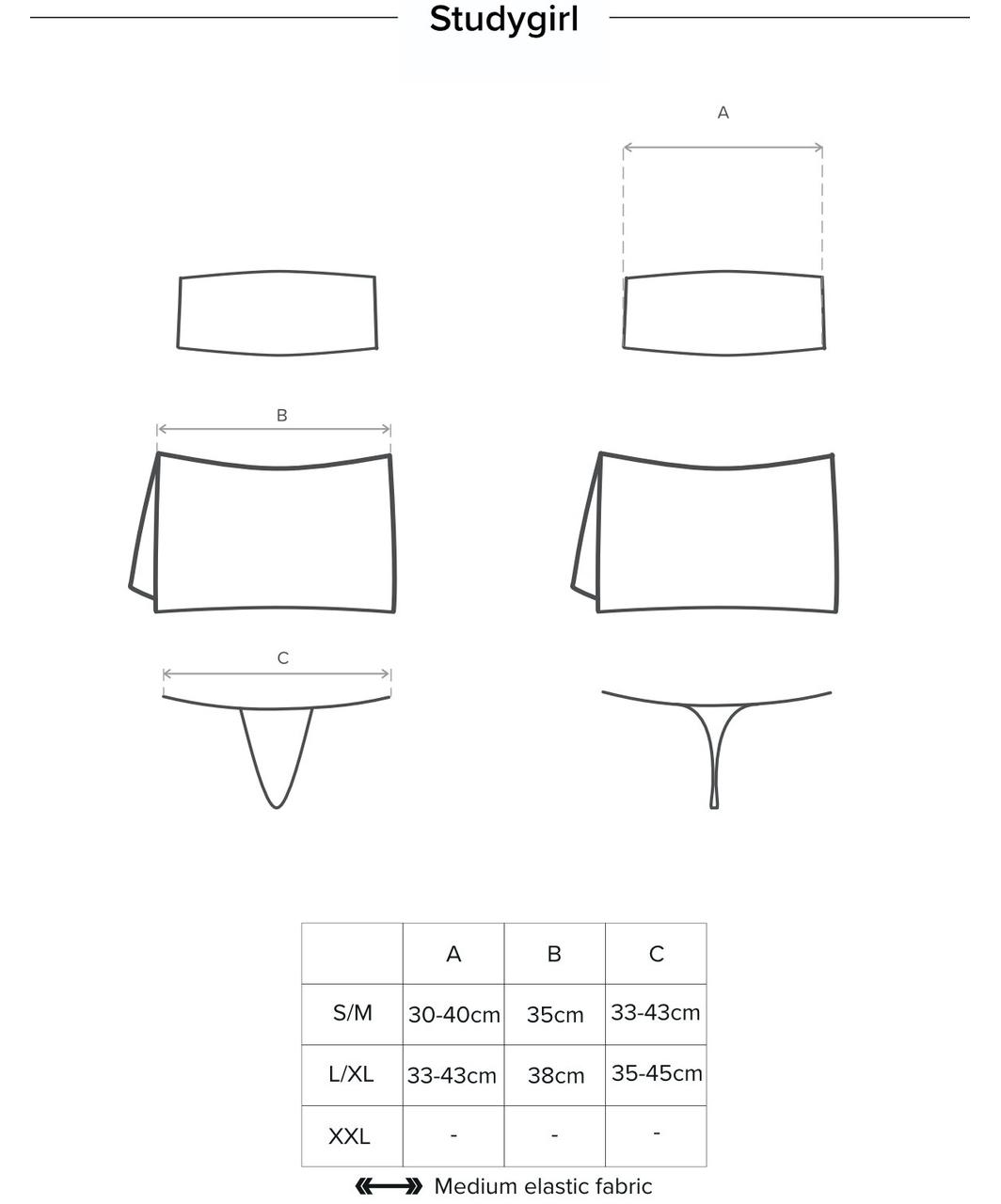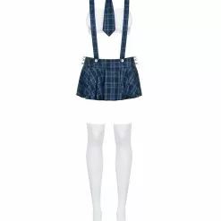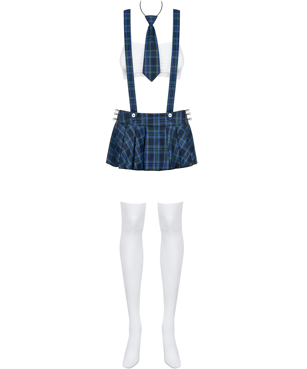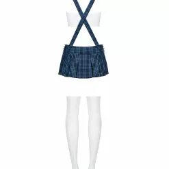 Sexy student outfit which includes white tight-fitting bandeau (strapless tube bra), blue checked pleated mini-skirt with braces crossed on the back, tie, white stockings and G-string. The skirt has lacing at either side.