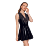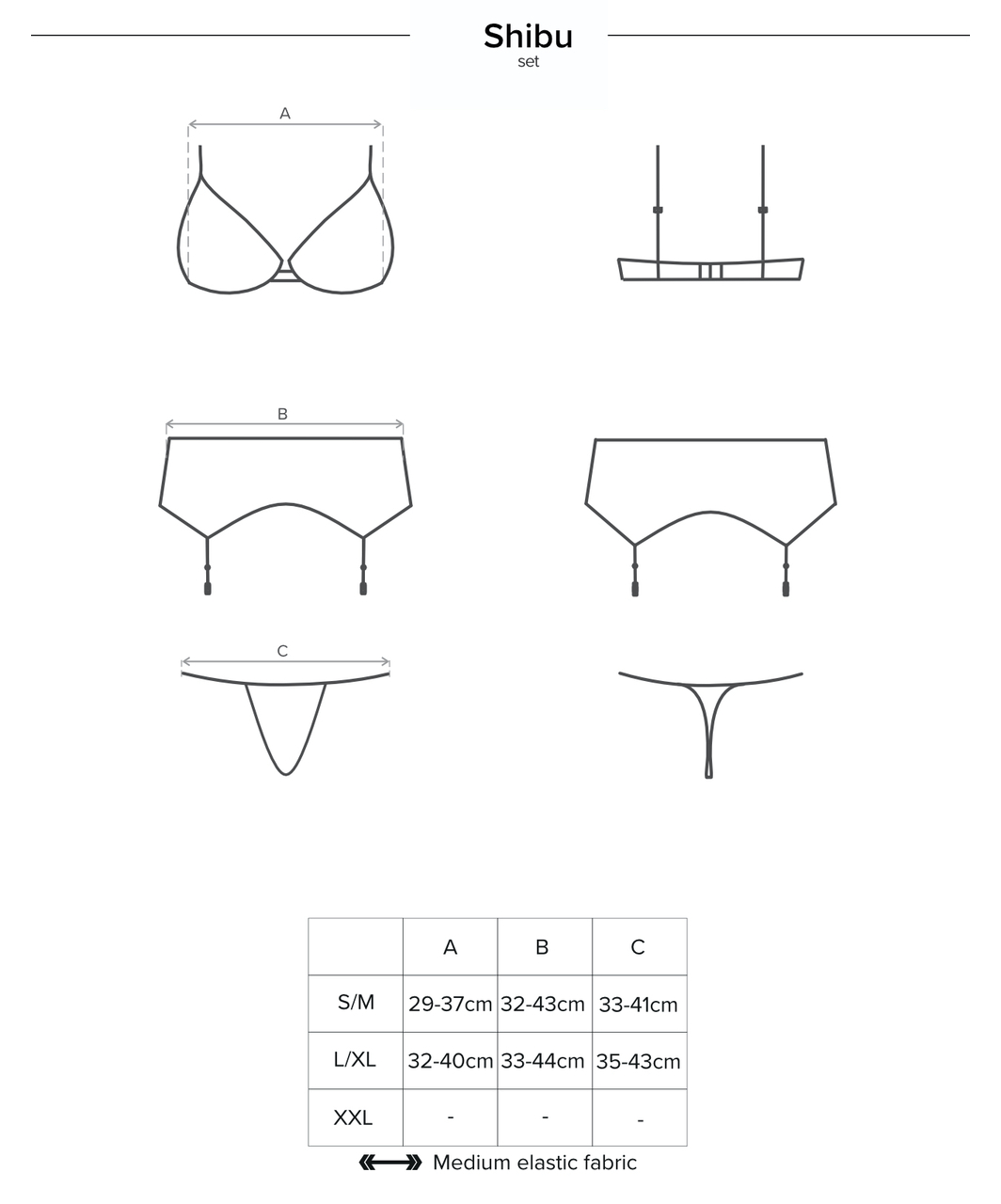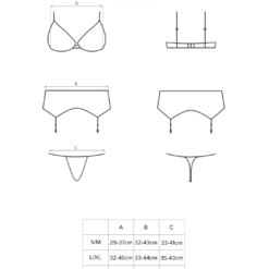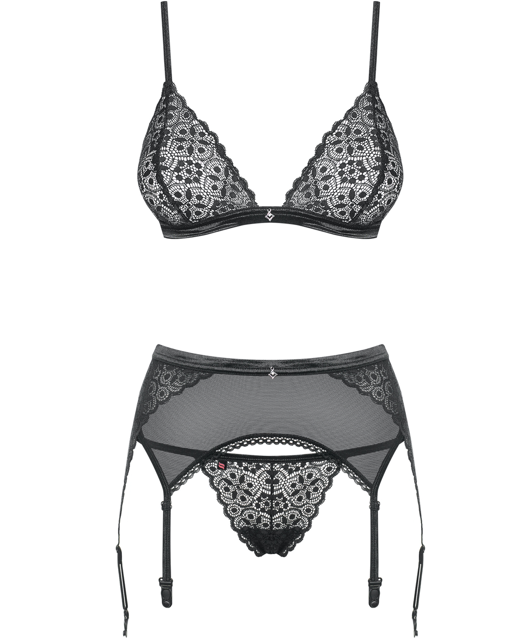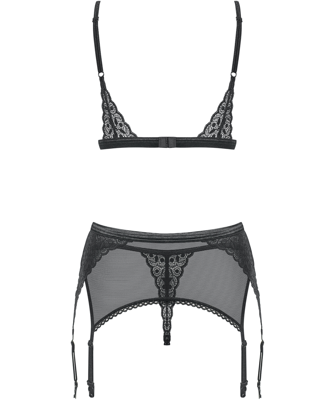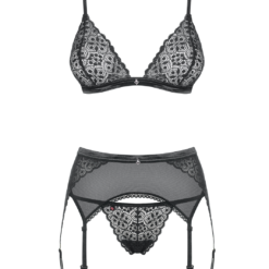 Coquettish tree-piece set made of black delicate lace and sheer mesh. Soft bra with adjustable straps and hook closure, completed with garter belt with 6 adjustable straps and also a G-string. Both bra and garter belt adorned with silver-coloured pendants. Without stockings.