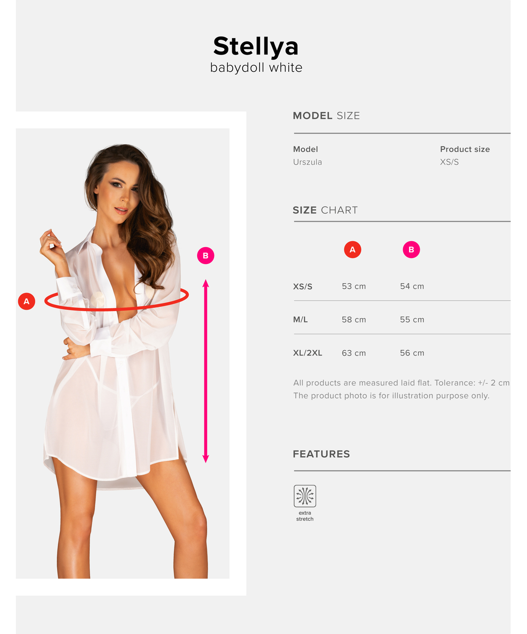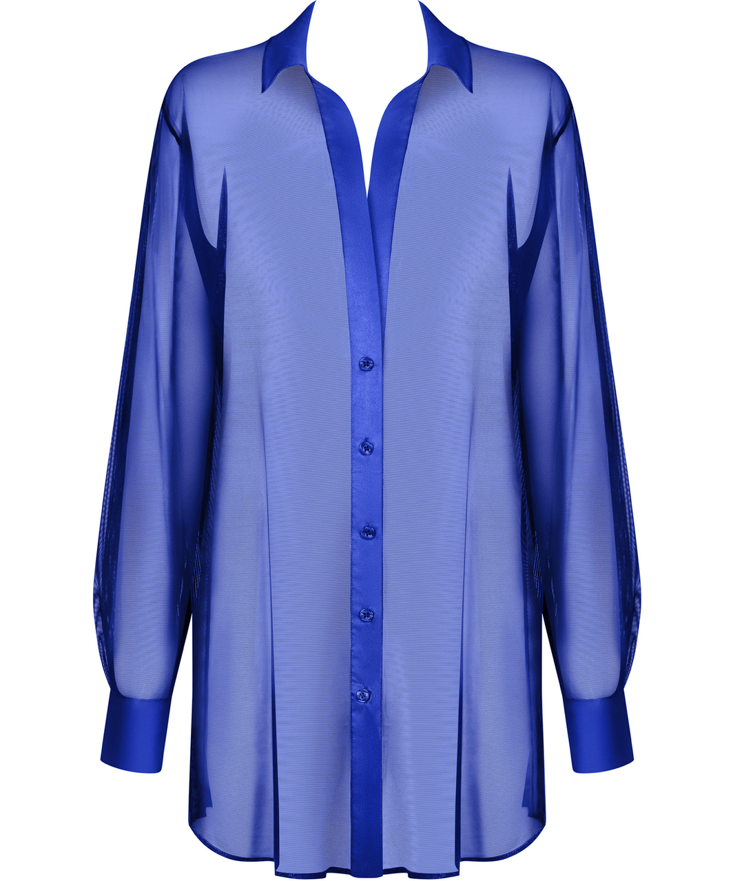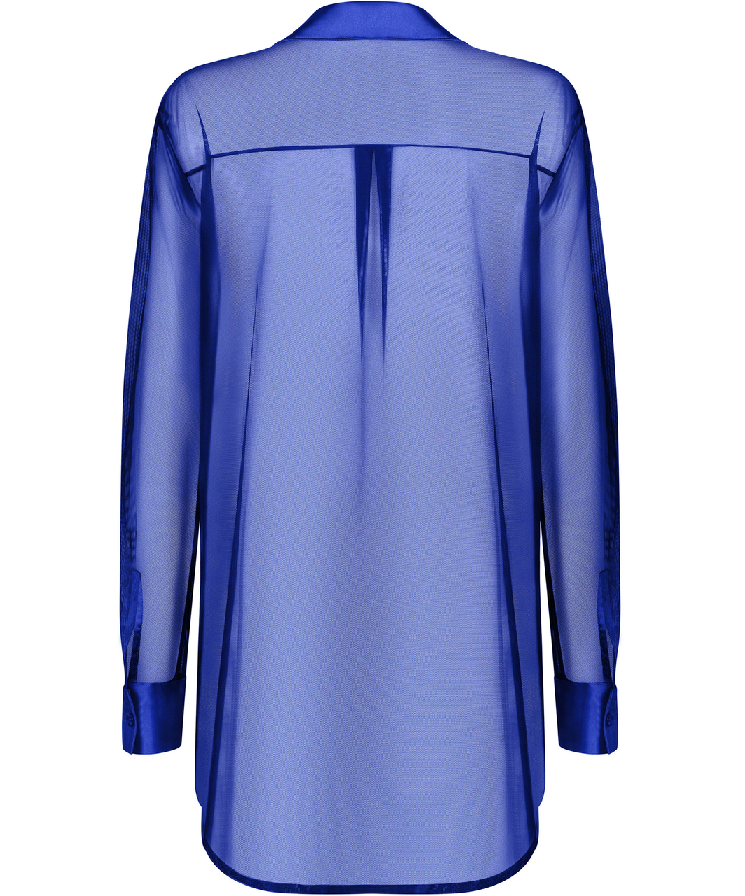 Cobalt blue morning negligee in a long sleeve shirt style made of see-through tulle with satin trimming. Wide cut, full front button closure and side slits.