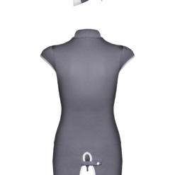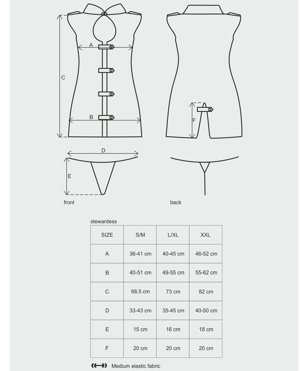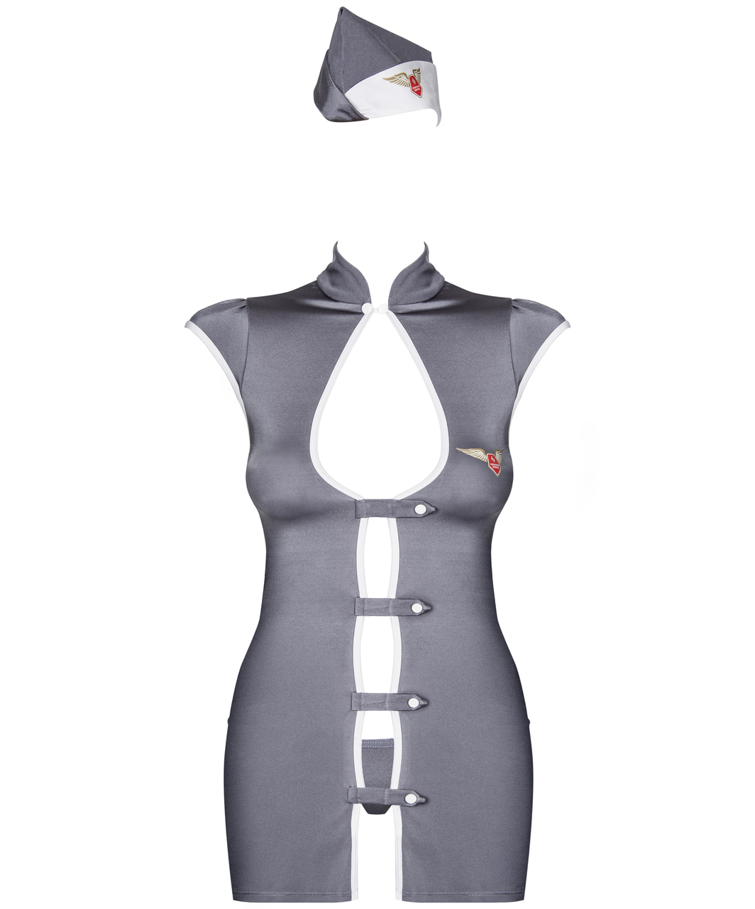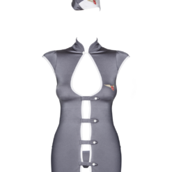 Feel the fantasy of being a sexy air hostess! The low cut tight-fitting sleeveless mini dress completed with side cap – stylish uniform with alluring slits and cabin crew patches. Matching thong included.