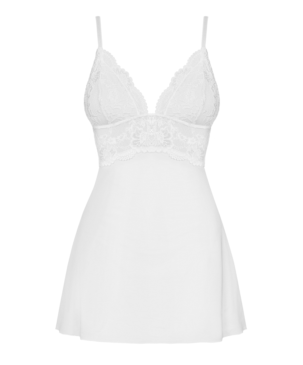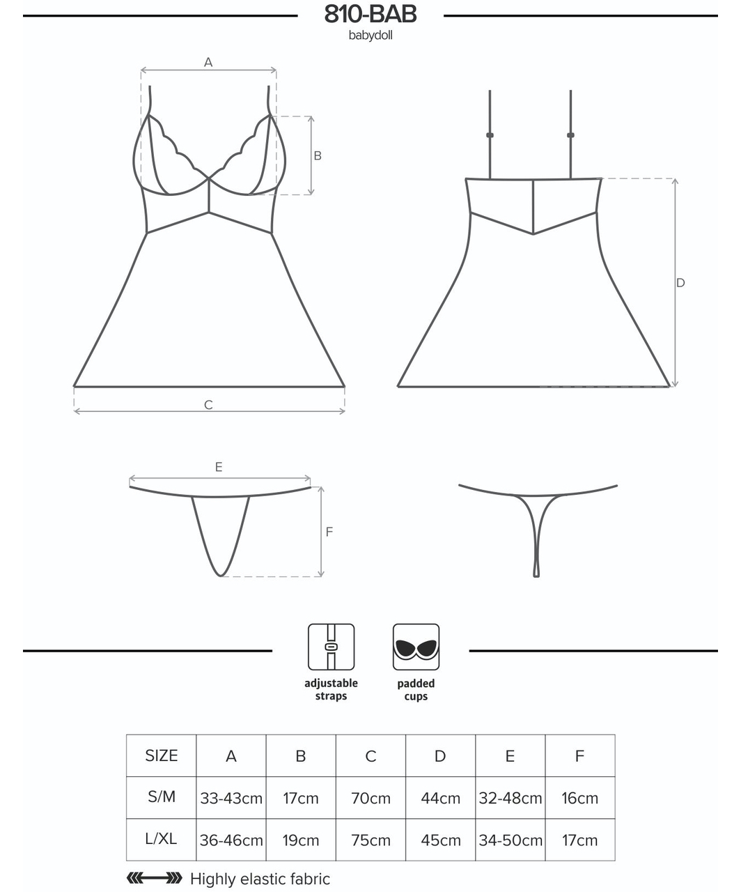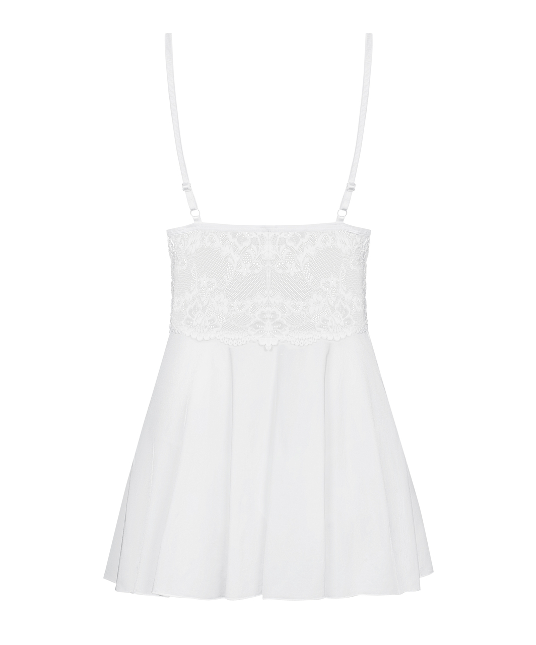 White satin babydoll with floral lace top and pudded cups. Adjustable straps. Matching G-string included.