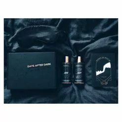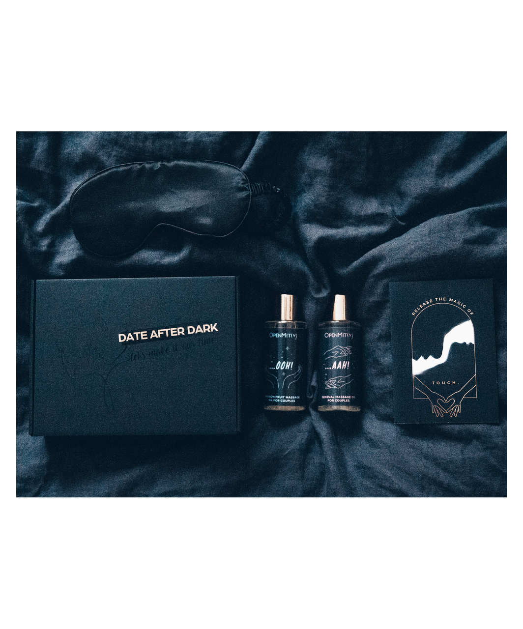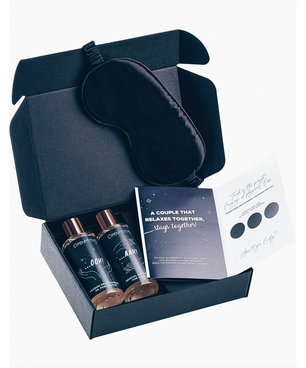 Two massage oil bottles, soft padded blindfold, scratch card with massage suggestions and short massage guide.