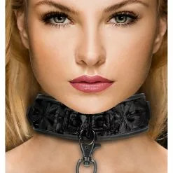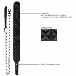 Slightly padded, collar with an embossed surface in a beautiful “diamond cut” pattern. With rounded borders. Includes a matte black leash with a snap hook and wrist loop (complete length 96 cm). Collar 5 cm wide, the circumference can be adjusted from 40 to 48 cm. Material: polyurethane, metal, split leather, synthetic rubber, phthalate-free according to EU Regulation REACH.
