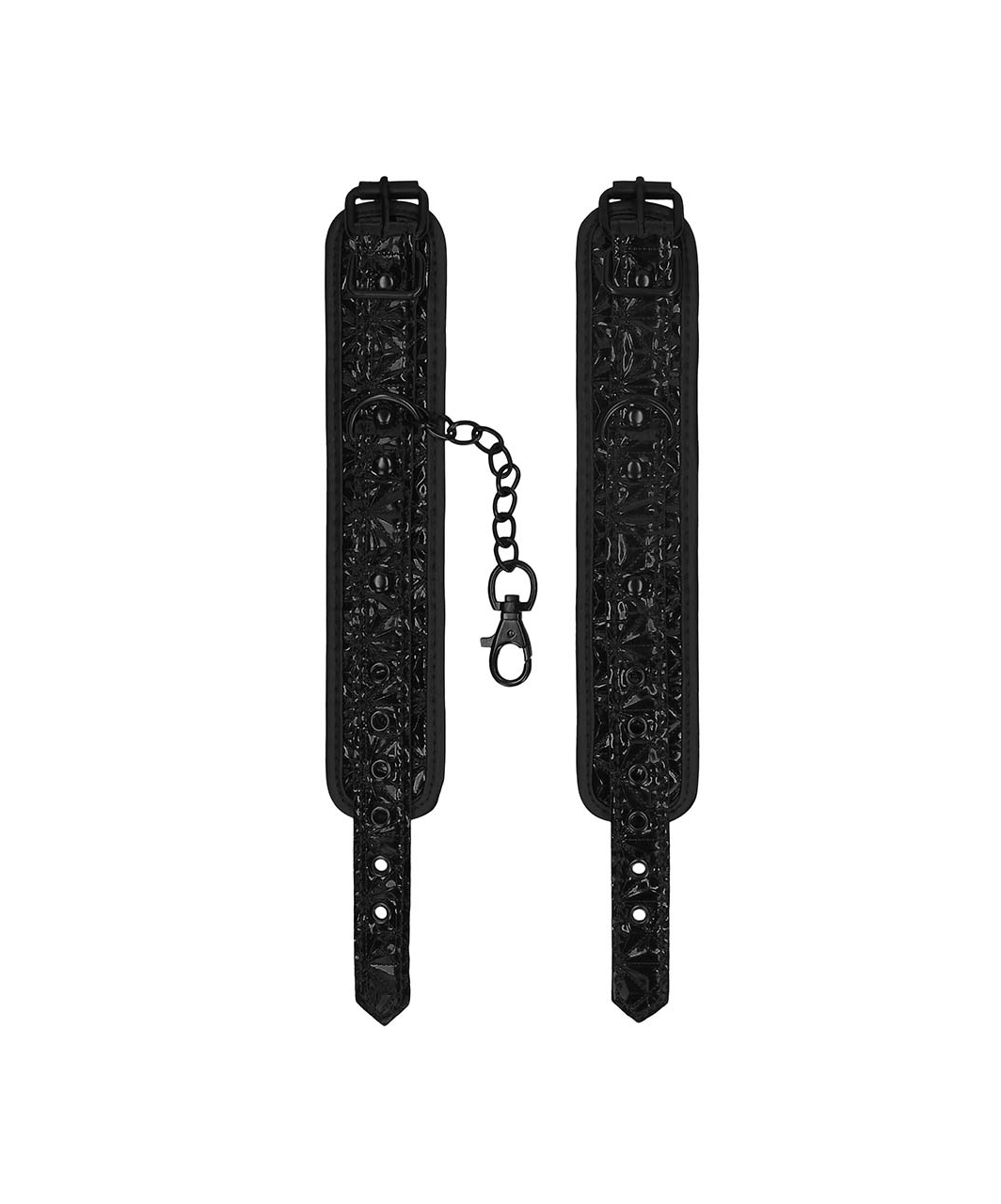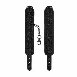 Enrich your BDSM play with these elegant yet super strong wrist cuffs! With 6 adjustable holes they will always guarantee a secure and snug fit. The wrist cuffs are slightly padded and have stitched border, joined together by a matte black connection chain with a snap hook. These wrist cuffs are not just great to use, but they also look good too because they have a embossed surface that is in a diamond pattern.