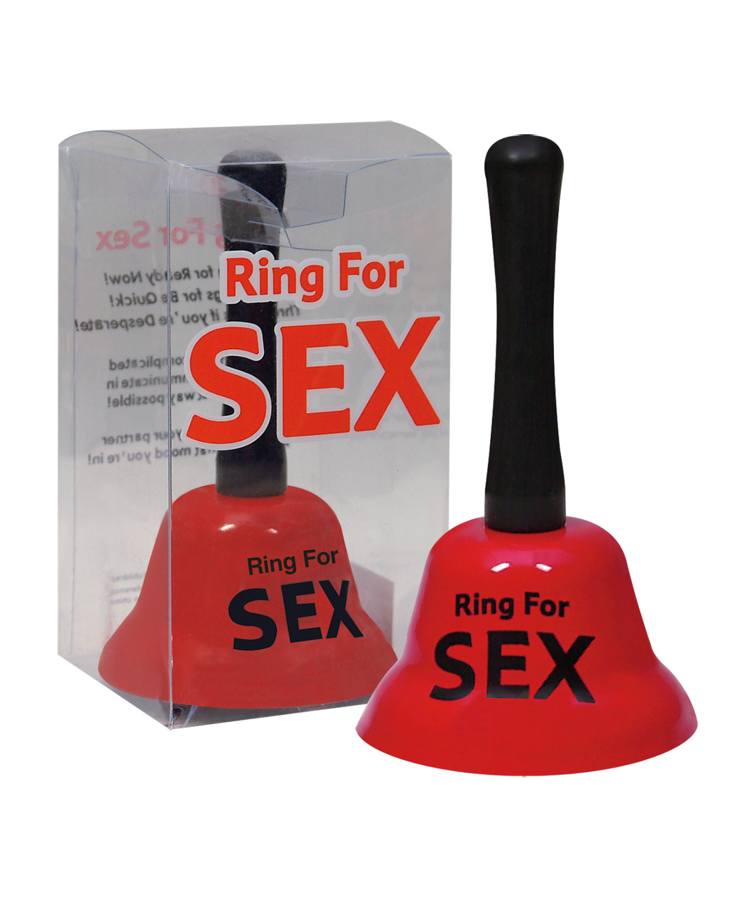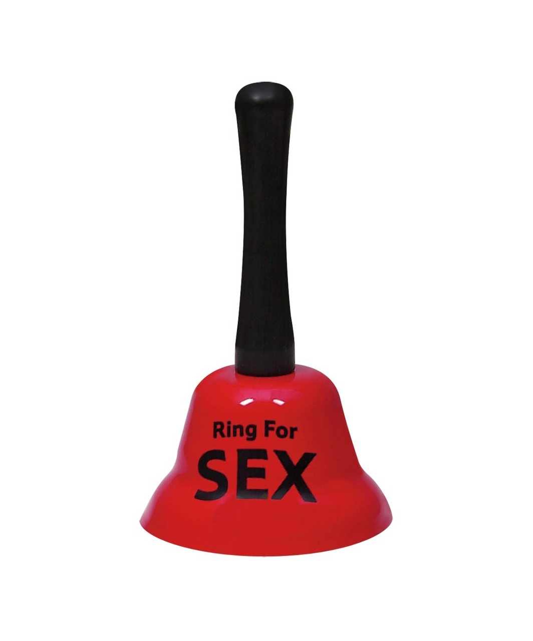Red metal bell with black print “Ring for Sex”. Ca. 14 cm high, Ø bell ca. 7.5 cm.