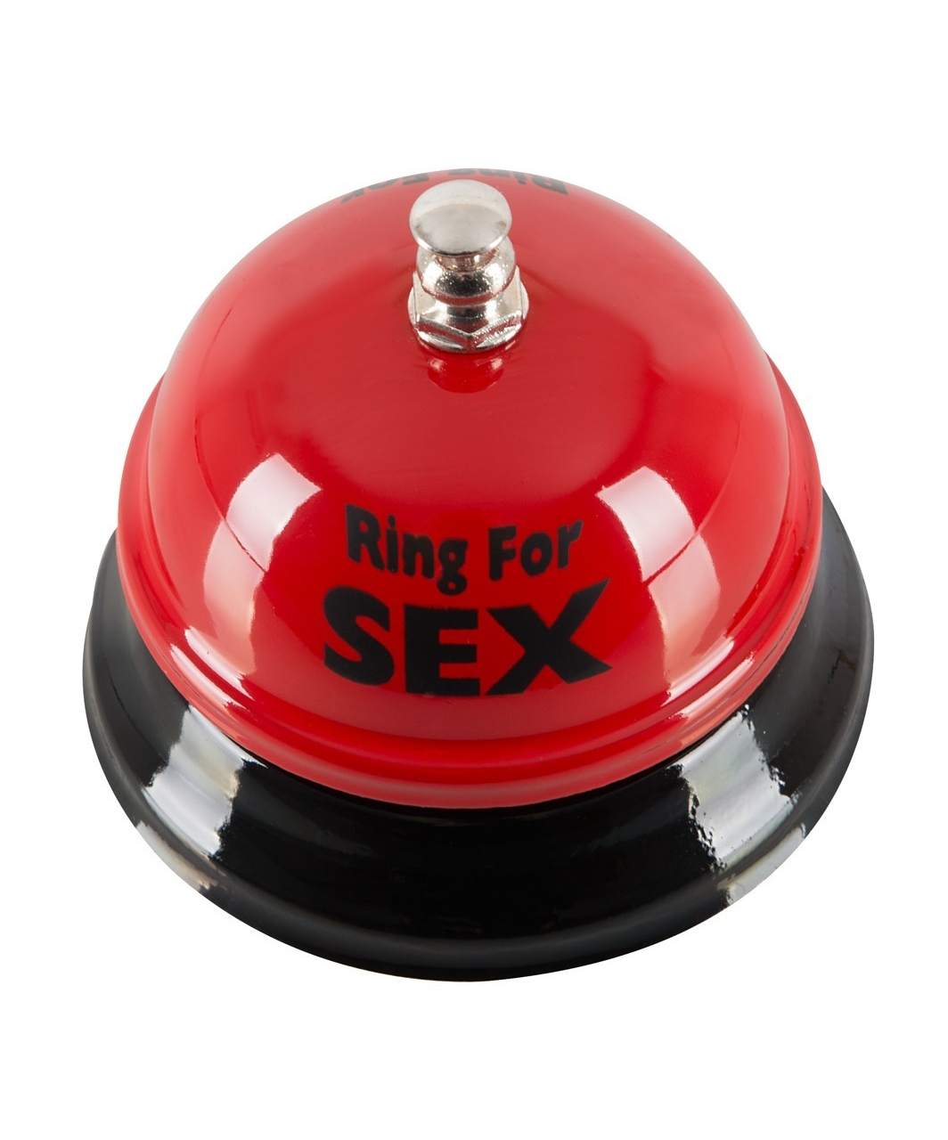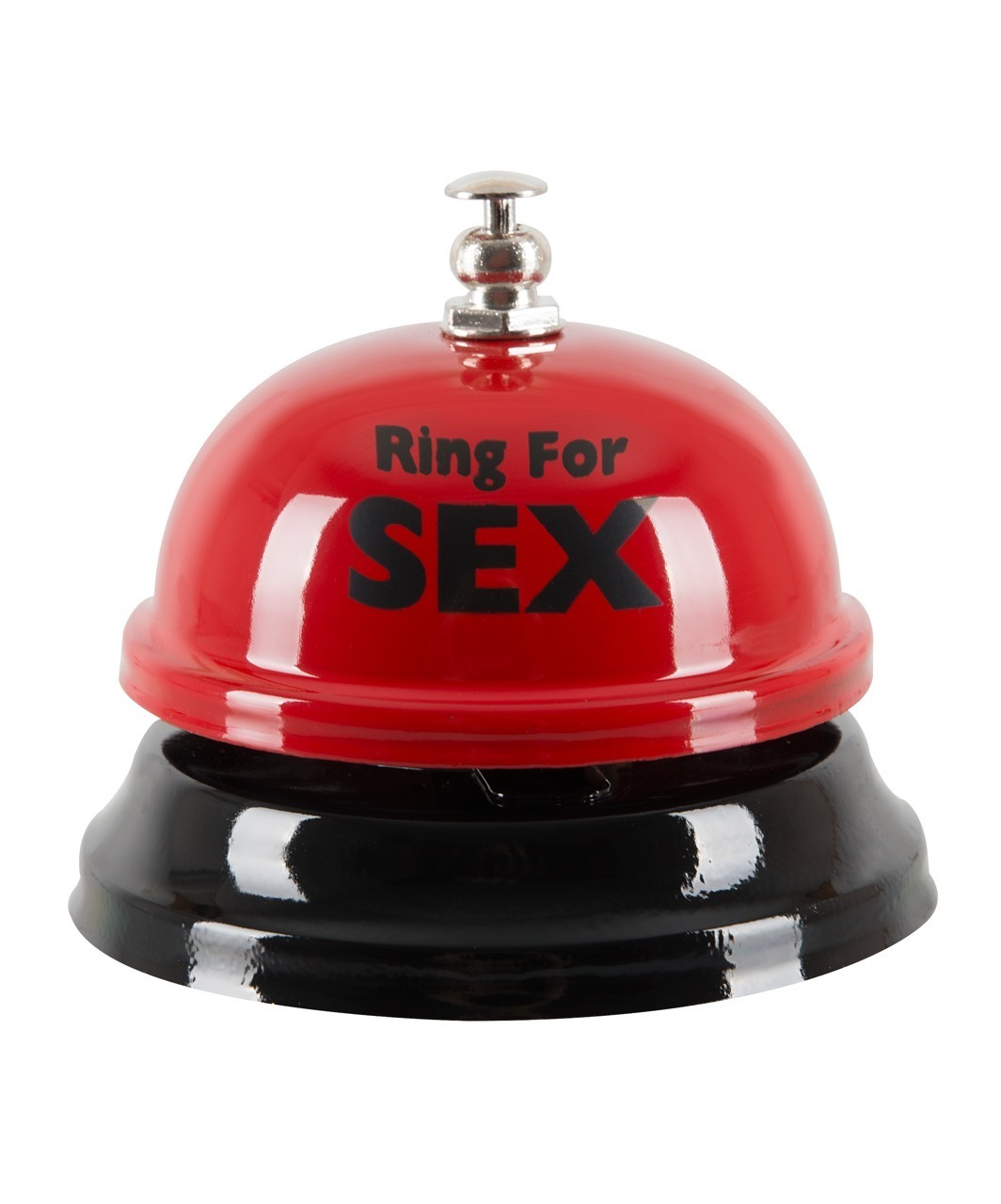 Red counter bell with white letters: Ring for Sex. Approx. size: 5,5 cm, 8 cm diameter. Material: metal.