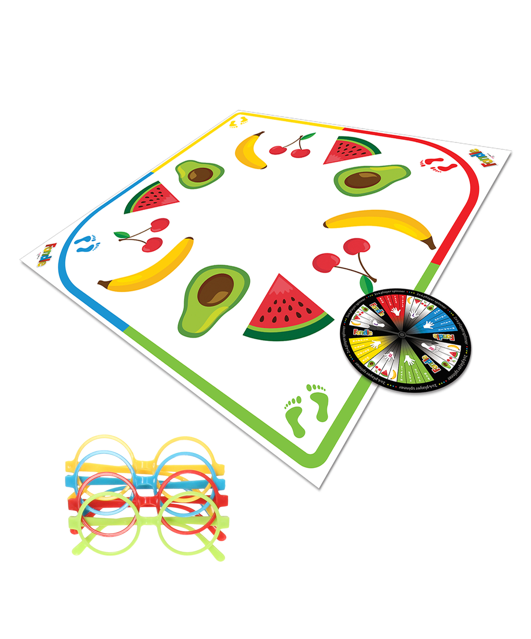 Included: 4 pairs of glasses, 1 play mat, double sided spinner.