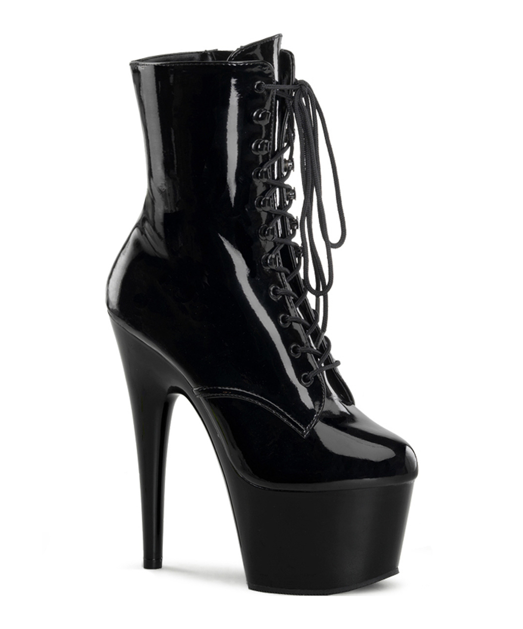 Black lacquered patent lace-up ankle boots with high platform, stiletto heel, vinyl insole and full inner side zipper.