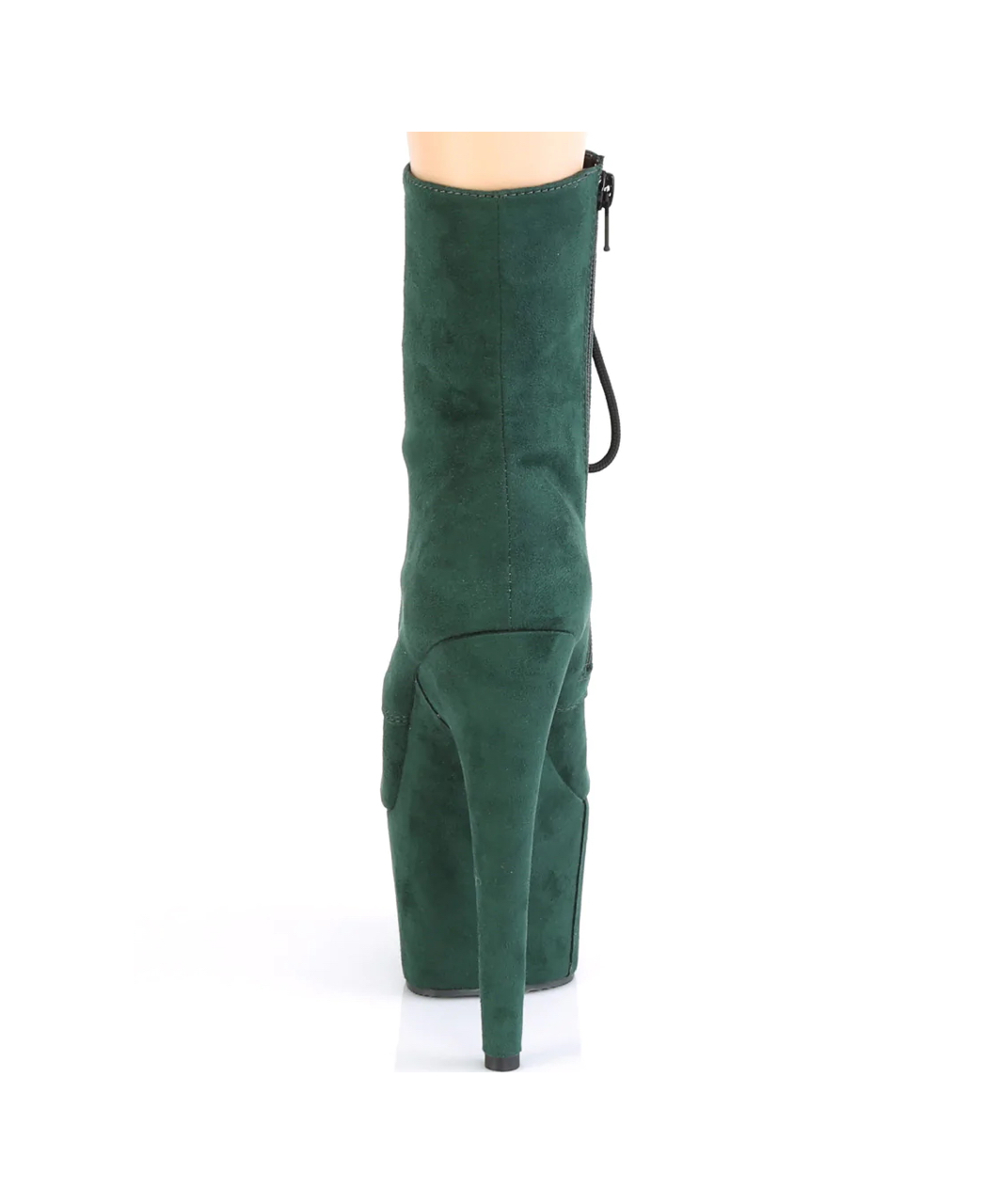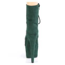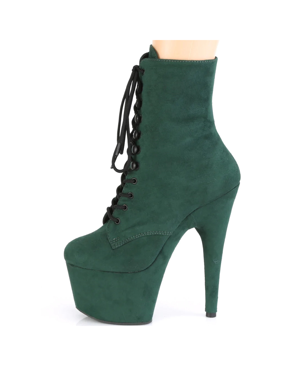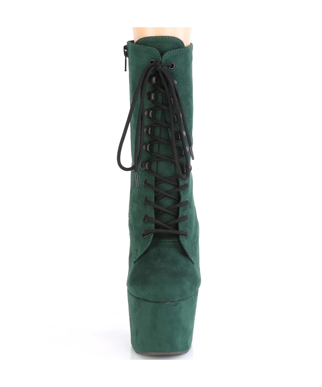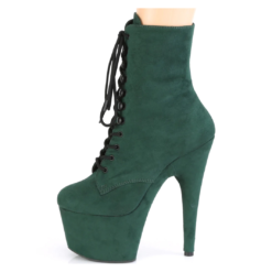 Emerald green faux suede lace-up ankle boots with high platform, stiletto heel, vinyl insole and full inner side zipper.