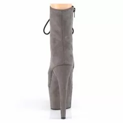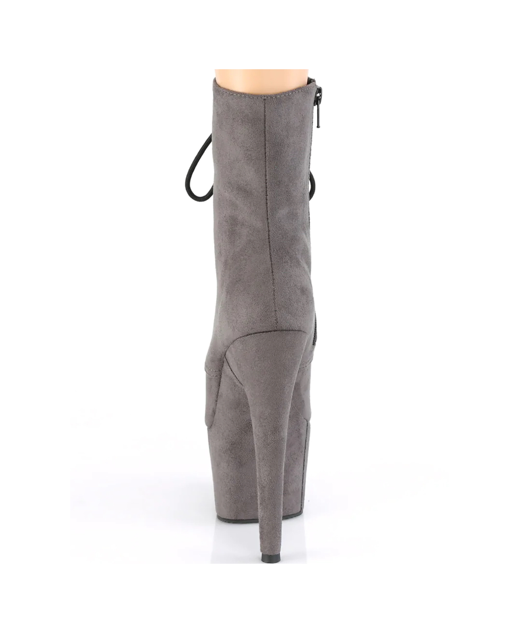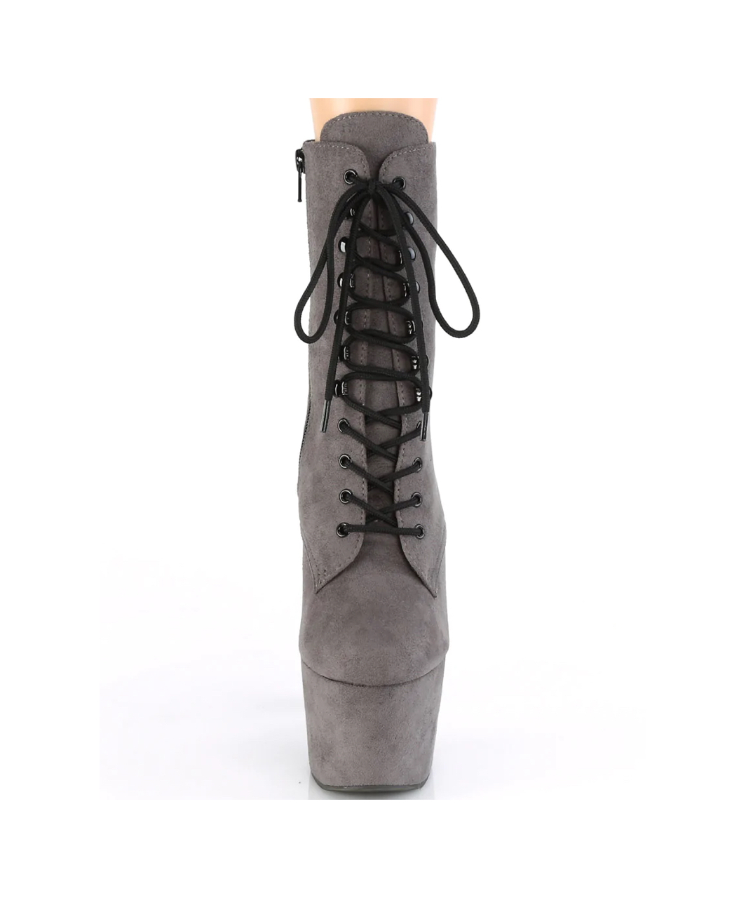 Grey faux suede lace-up ankle boots with high platform, stiletto heel, vinyl insole and full inner side zipper.