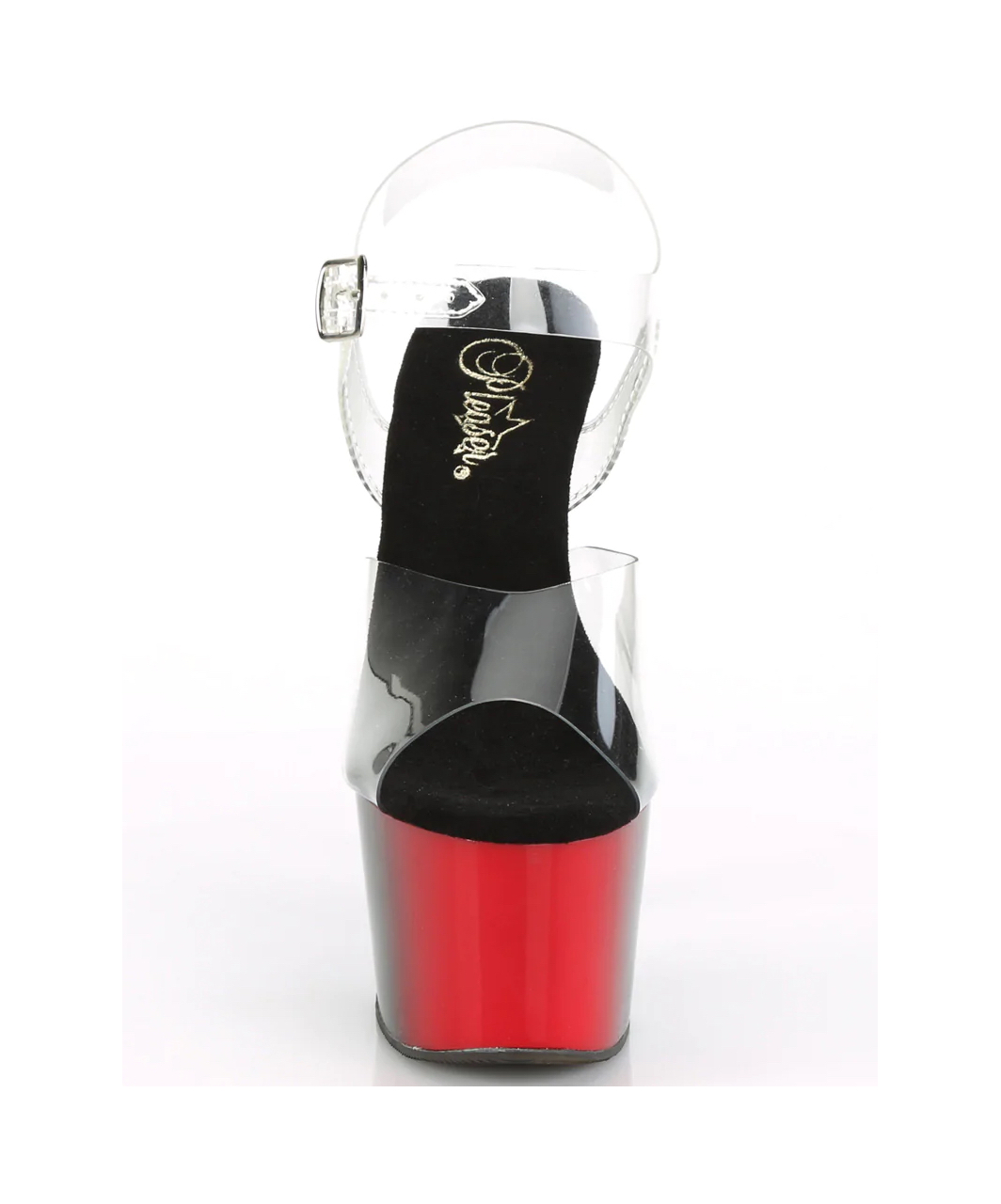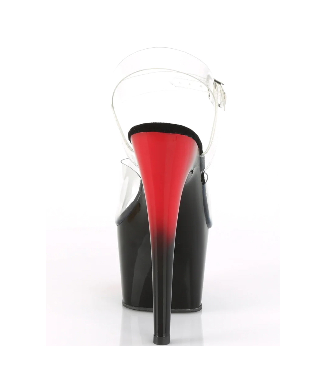Transparent vinyl open toe ankle strap sandals with high two tone platform, stiletto heel and microfiber insole.