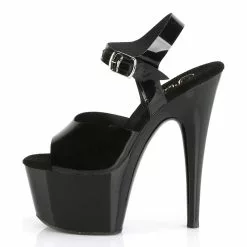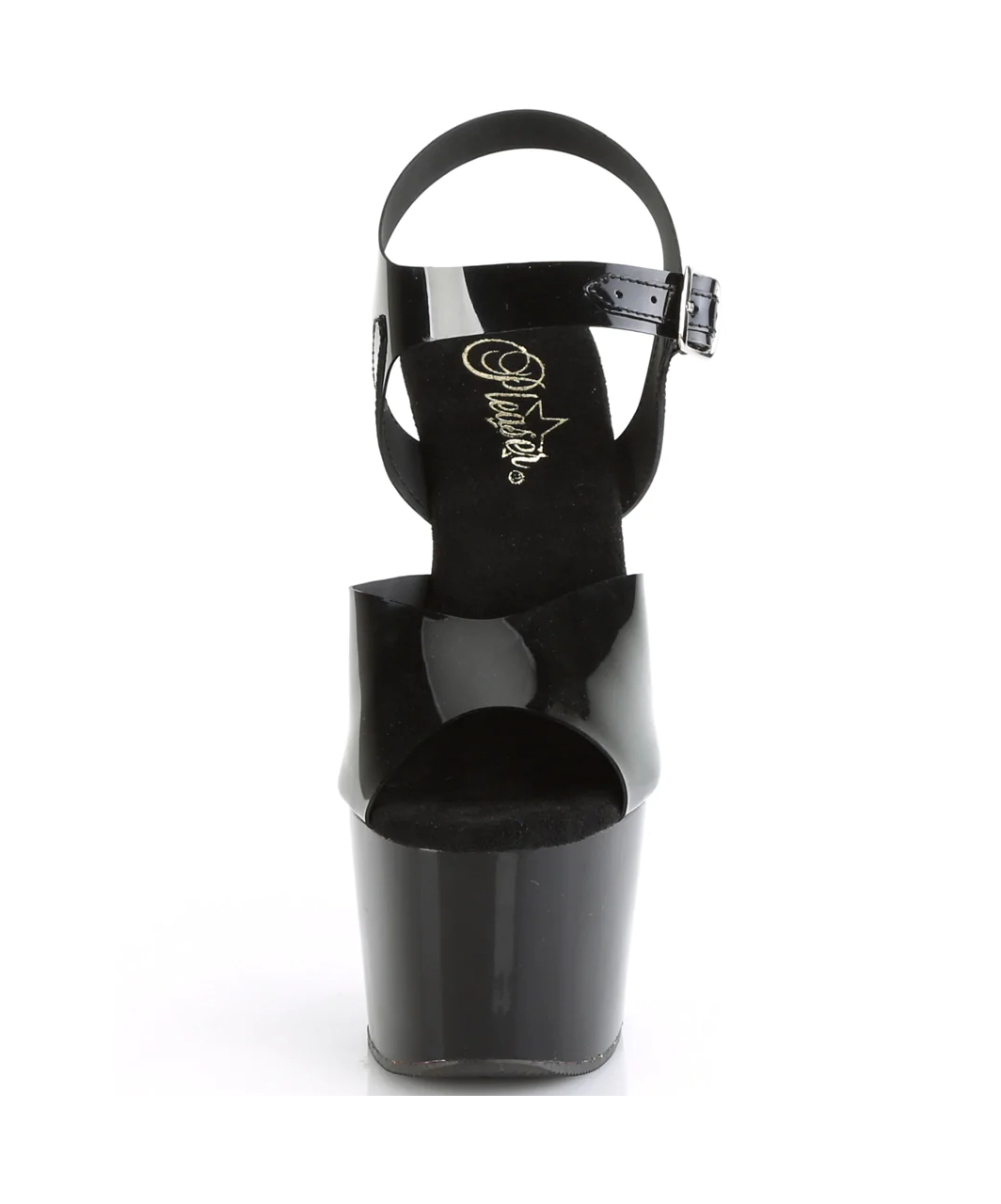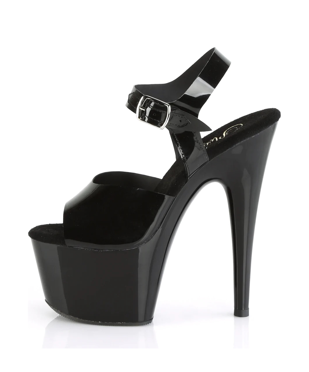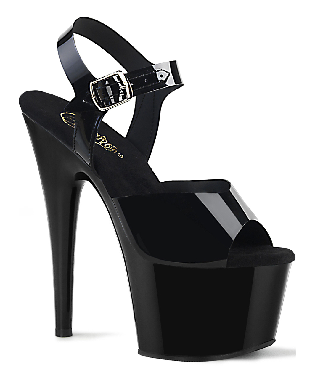 Black jelly-like PU open toe ankle strap sandals with high platform, stiletto heel and microfiber insole.
