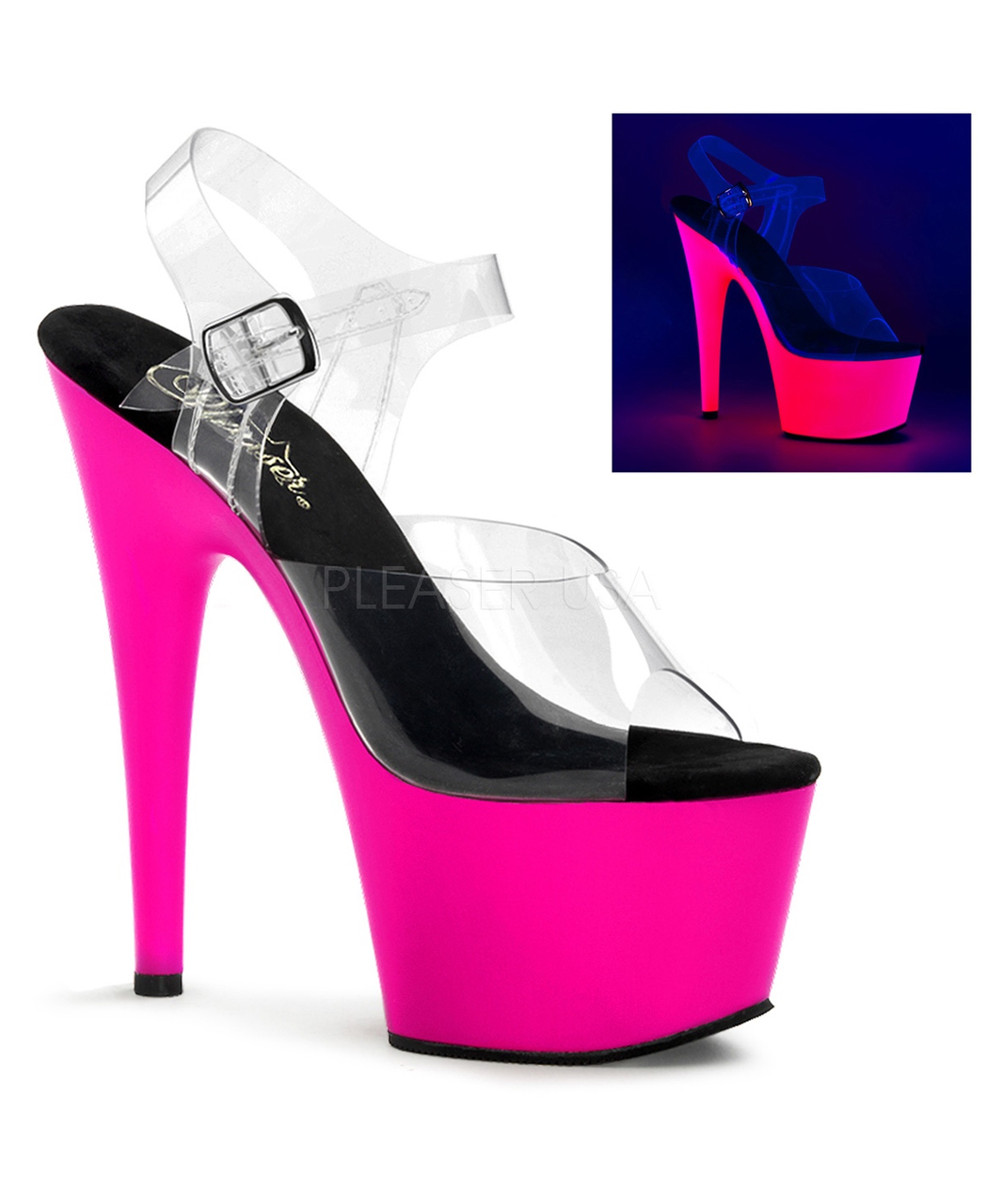 17 cm stiletto heel with 7 cm platform. UV blacklight effect in glowing neon colors. Clear ankle strap and wide top strap with front square cut-out detail.