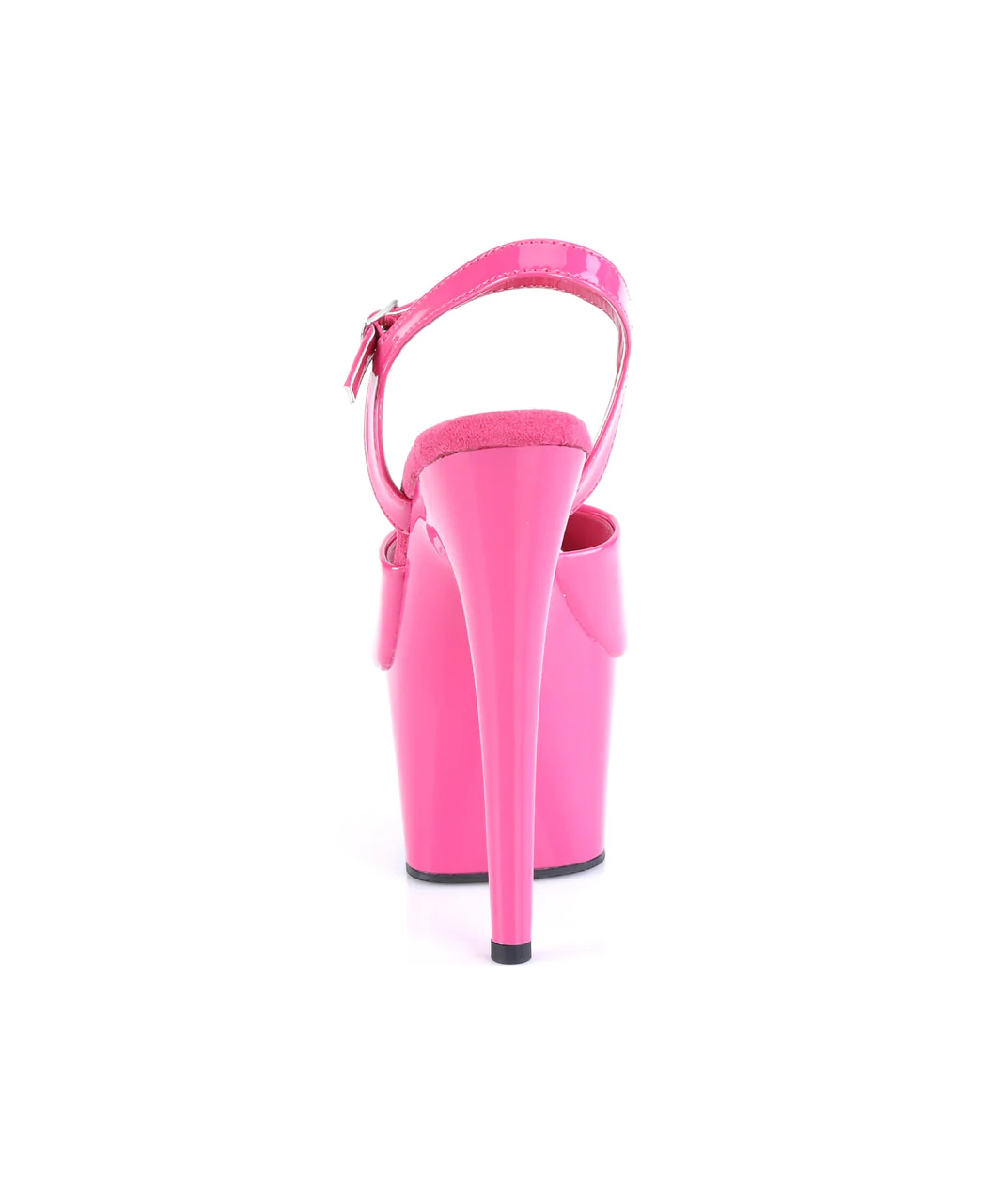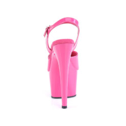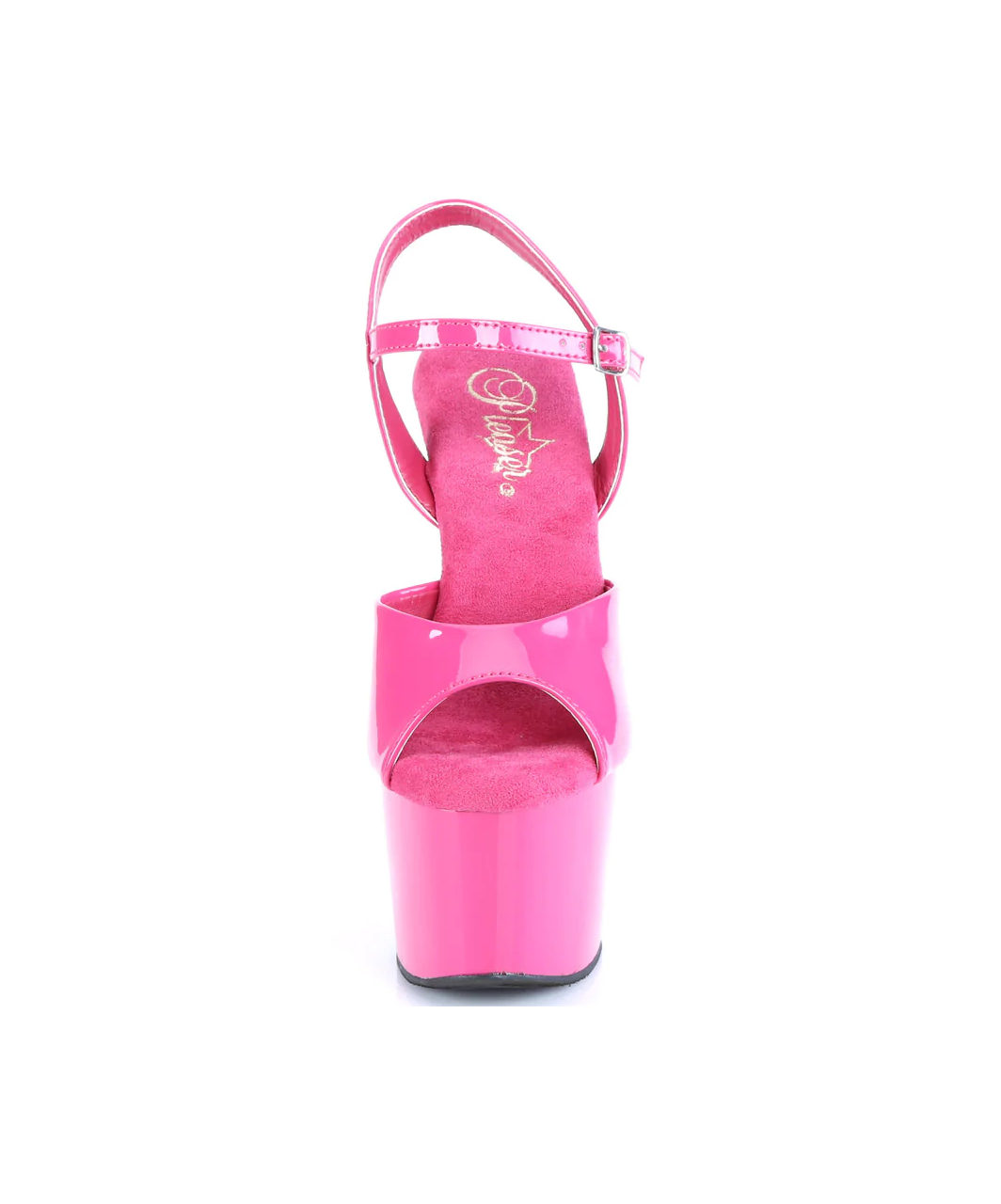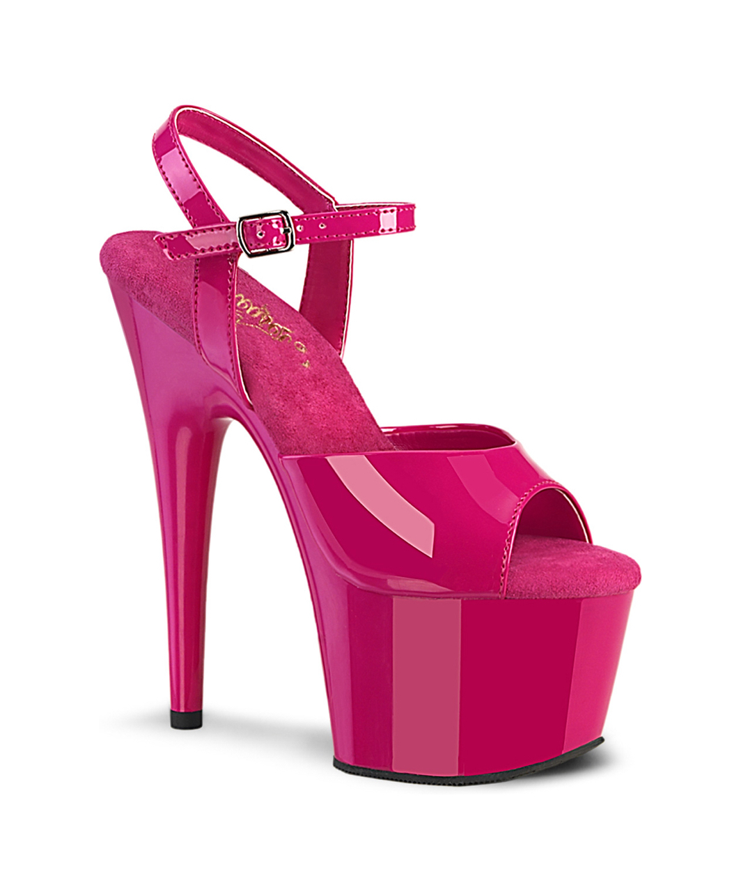 Pink lacquered patent open toe ankle strap sandals with high platform, stiletto heel and microfiber insole.