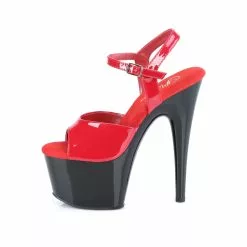 Red lacquered patent open toe ankle strap sandals with high black platform, stiletto heel and red microfiber insole.