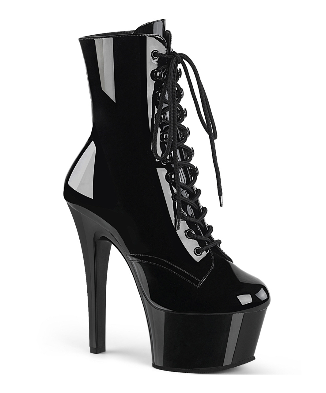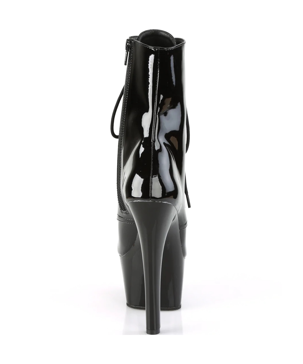 Black lacquered patent lace-up ankle boots with high platform, stiletto heel, vinyl insole and full inner side zipper.