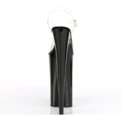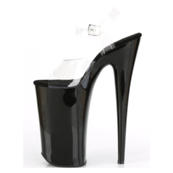 Transparent vinyl open toe ankle strap sandals with ultra high black platform, stiletto heel and microfibre insole.