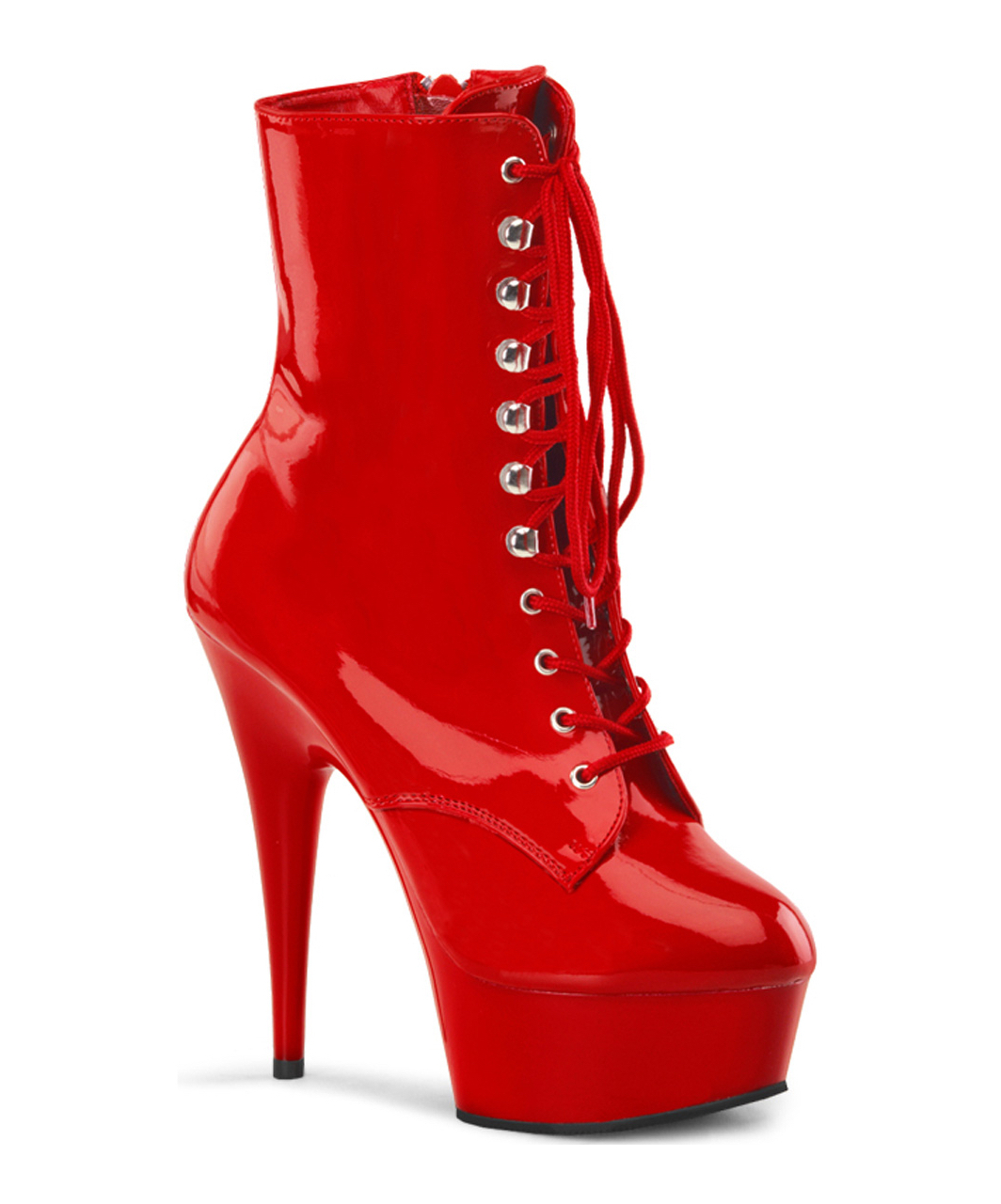 Red patent leather lace-up ankle boots with full inner side zipper.