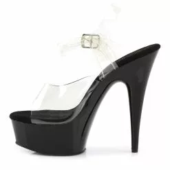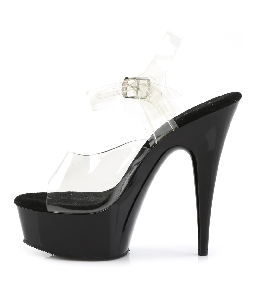 Black platform shoes, 15 cm stilettos with clear straps and wide top strap, black soft inner sole. .