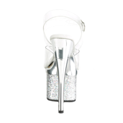 Transparent vinyl open toe ankle strap sandals with high silver chrome plated platform featuring holographic glitter, stiletto heel and microfiber insole.