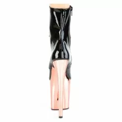 Black lacquered patent lace-up ankle boots with extra high rose gold chrome plated platform, stiletto heel, vinyl insole and full inner side zipper.