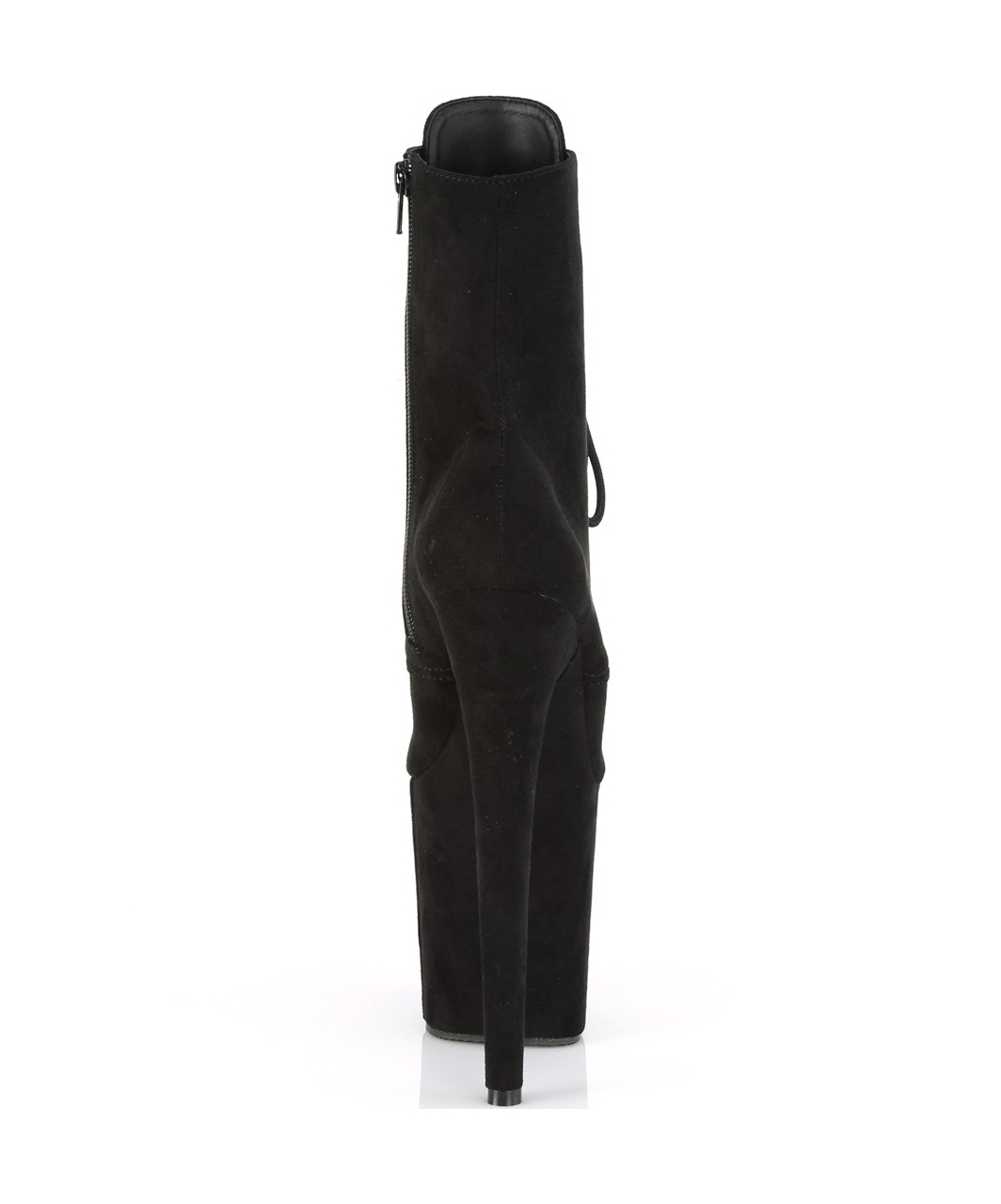 Black faux suede lace-up ankle boots with full inner side zipper. Extra high platform and stiletto heel.