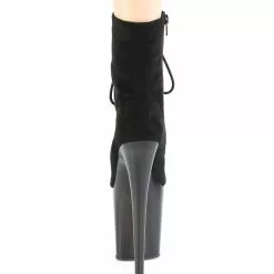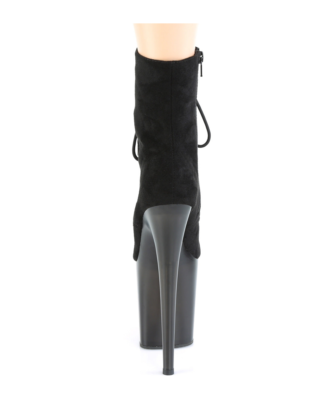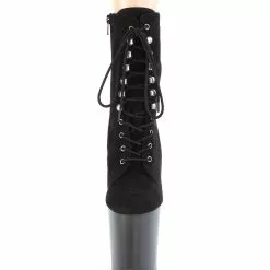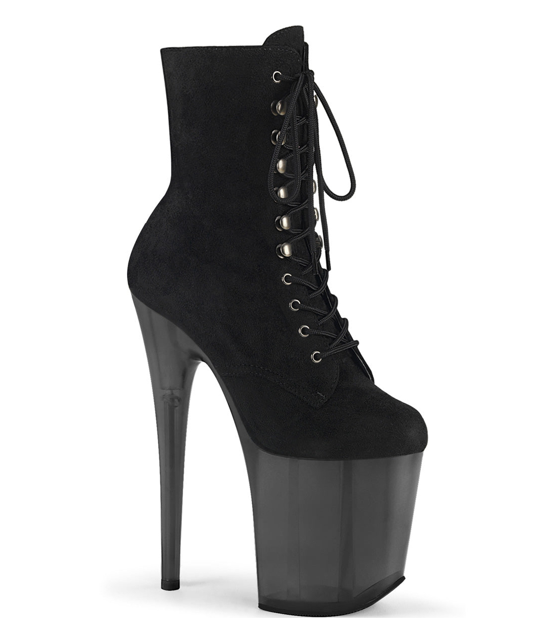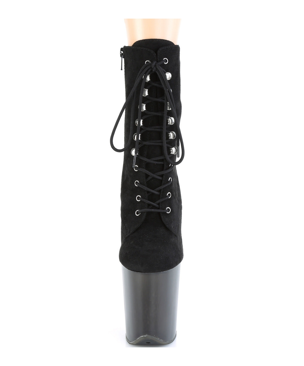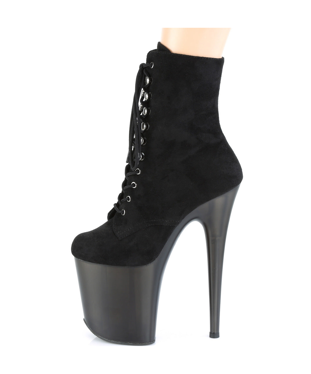 Black faux suede lace-up ankle boots with full inner side zipper. Extra high tinted platform and stiletto heel.