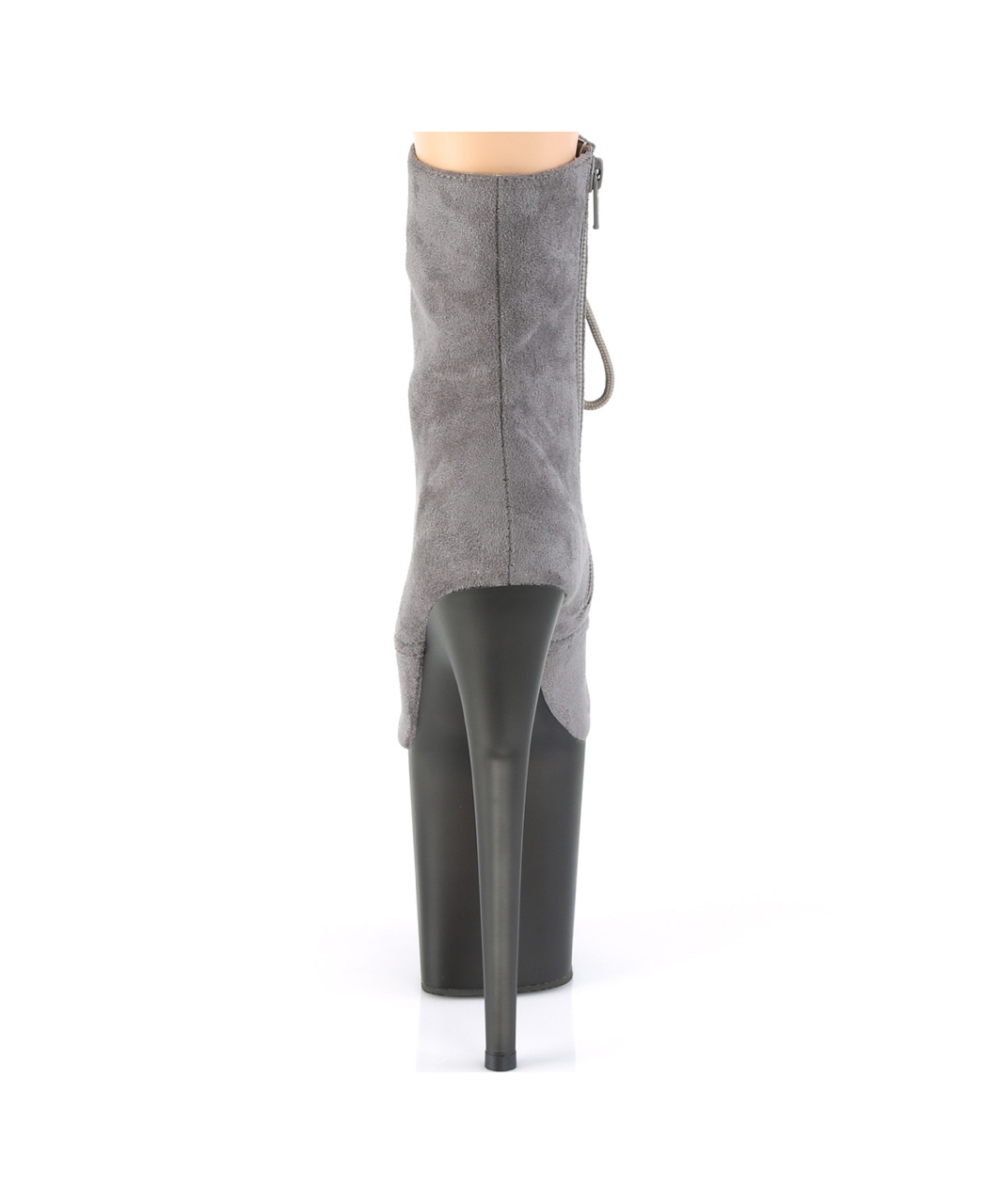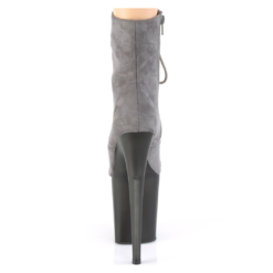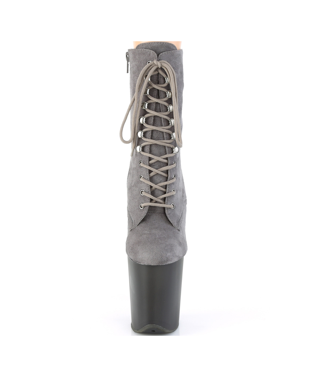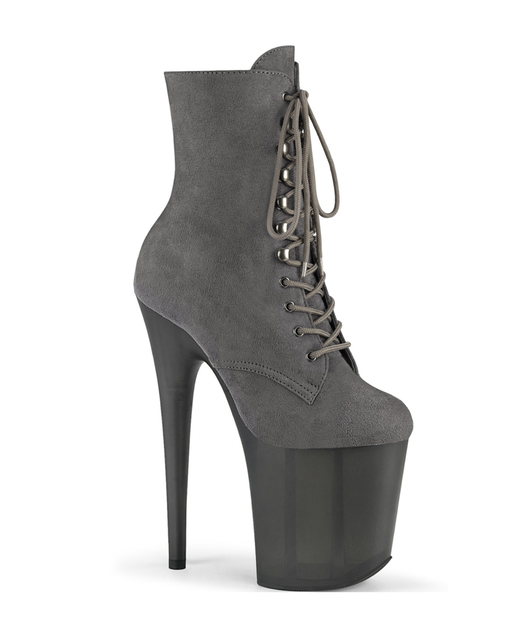 Grey faux suede lace-up ankle boots with extra high tinted platform, stiletto heel, vinyl insole and full inner side zipper.