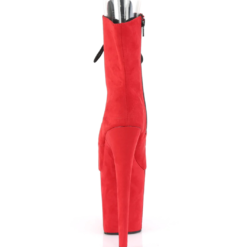 Red faux suede open toe lace-up ankle boots with extra high platform, stiletto heel, microfiber insole and full inner side zipper.