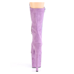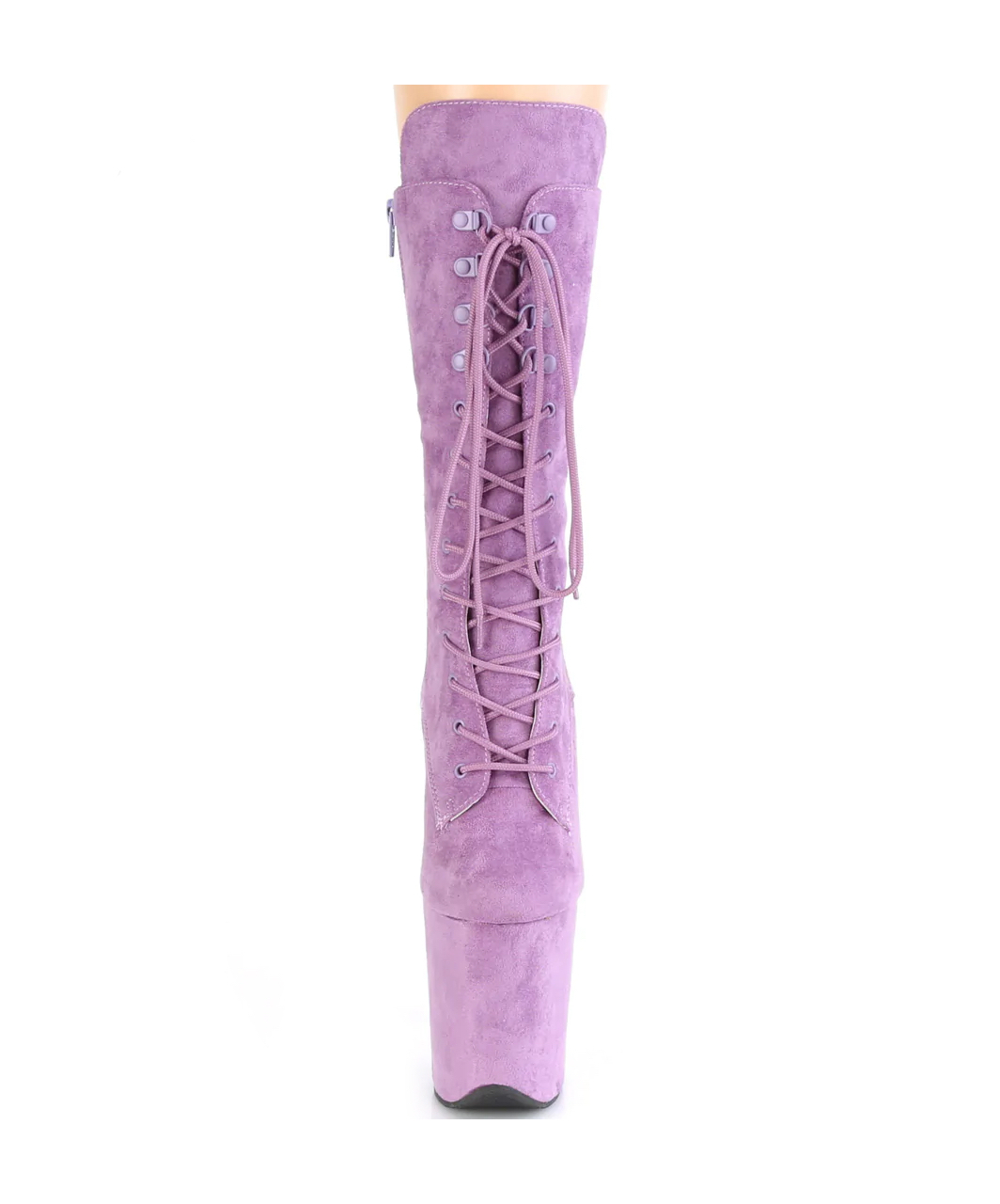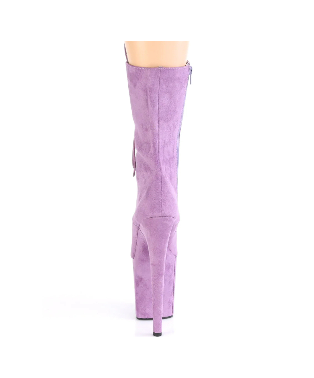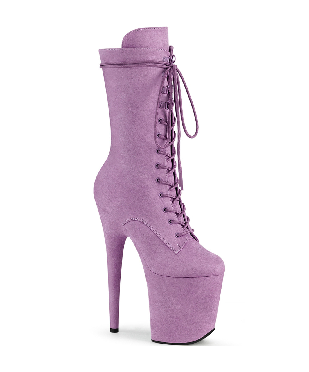 Lilac faux suede lace-up ankle boots with extra high platform, stiletto heel, vinyl insole and full inner side zipper.