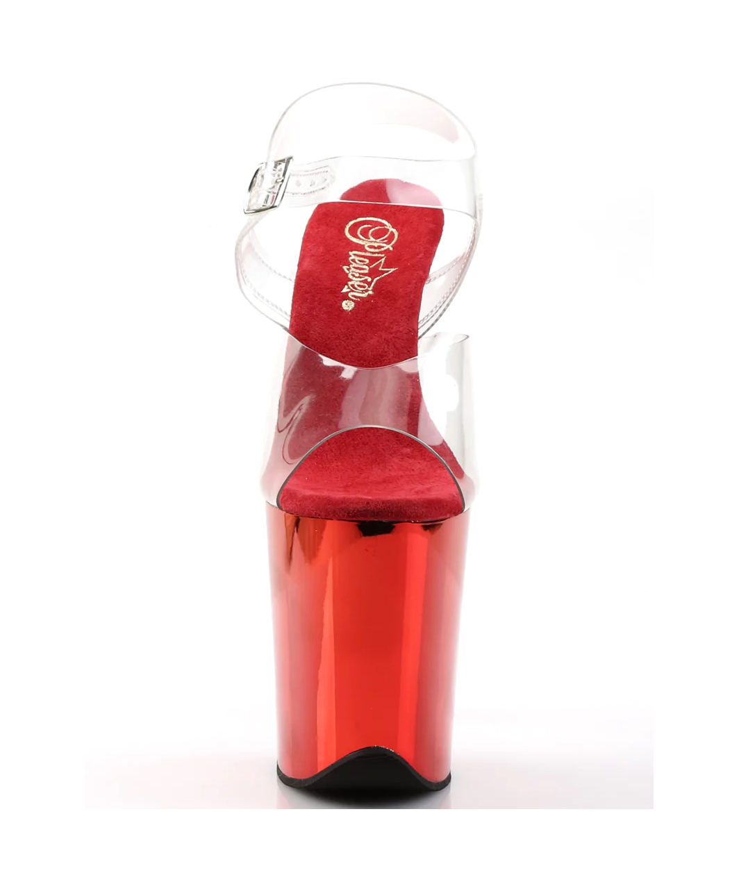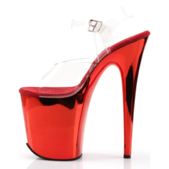 Transparent vinyl open toe ankle strap sandals with extra high red chrome plated platform, stiletto heel and black microfiber insole.